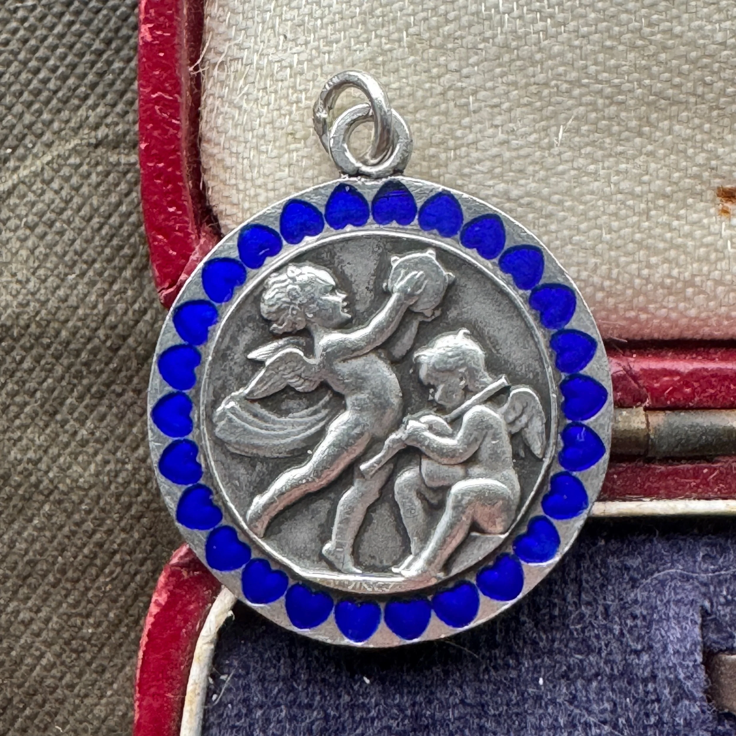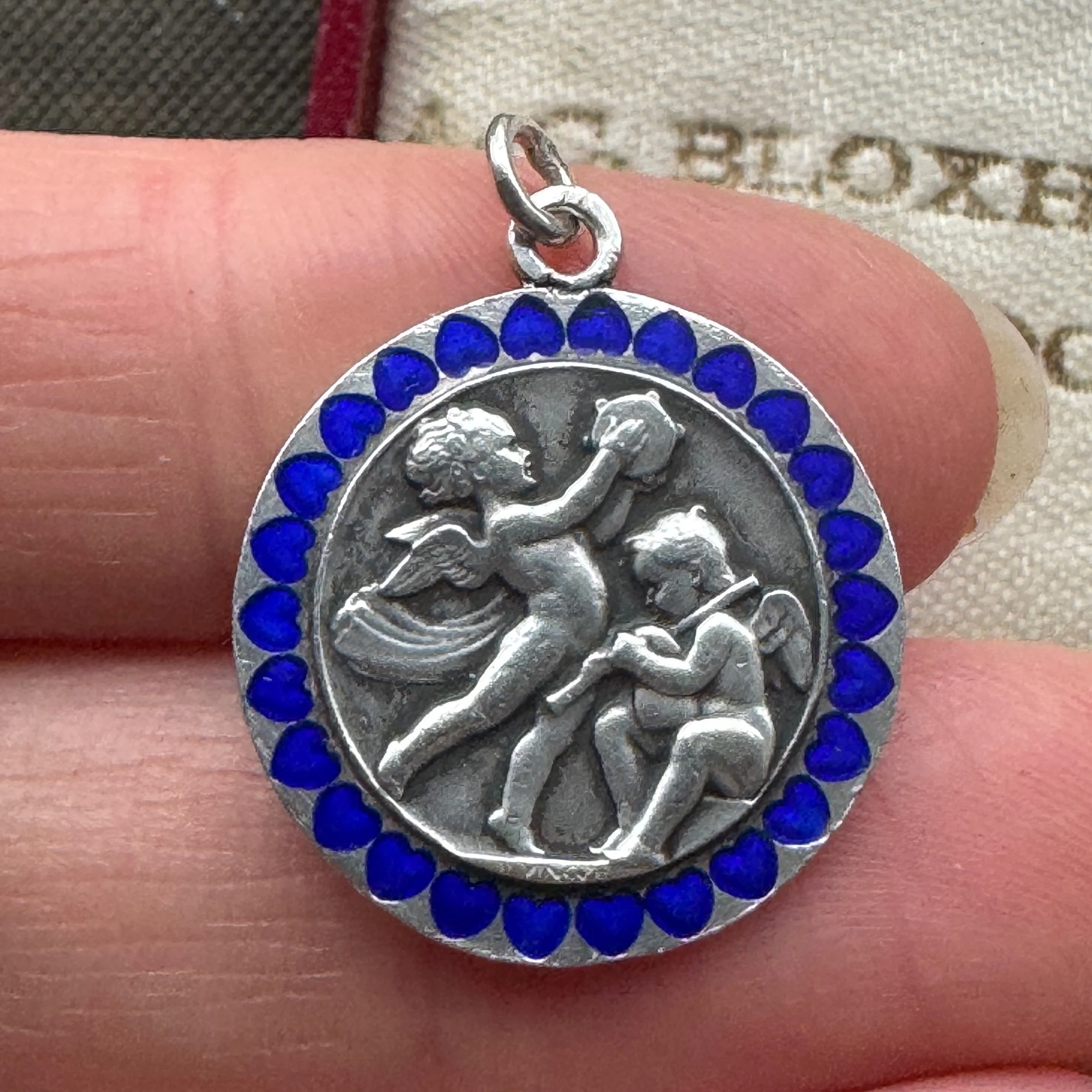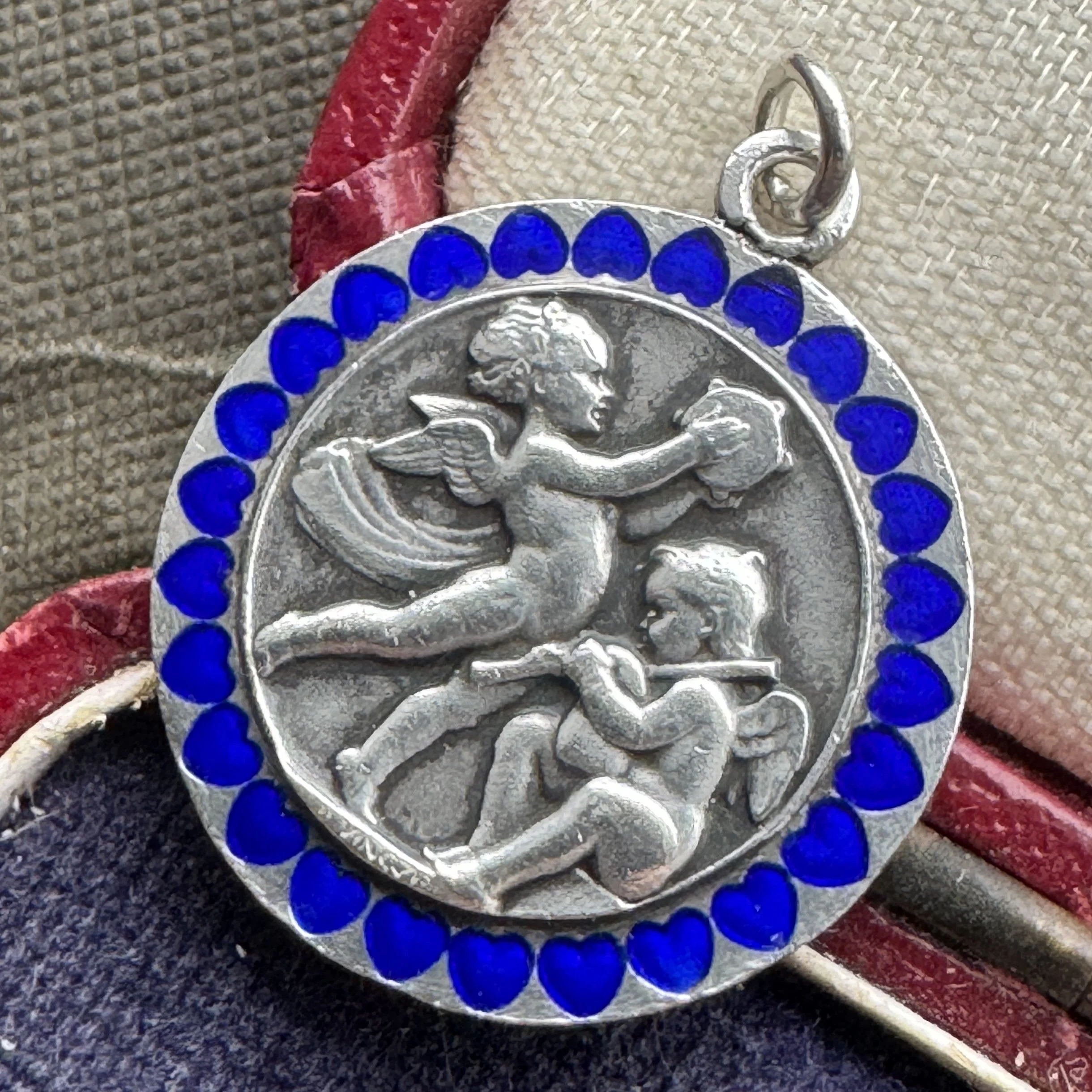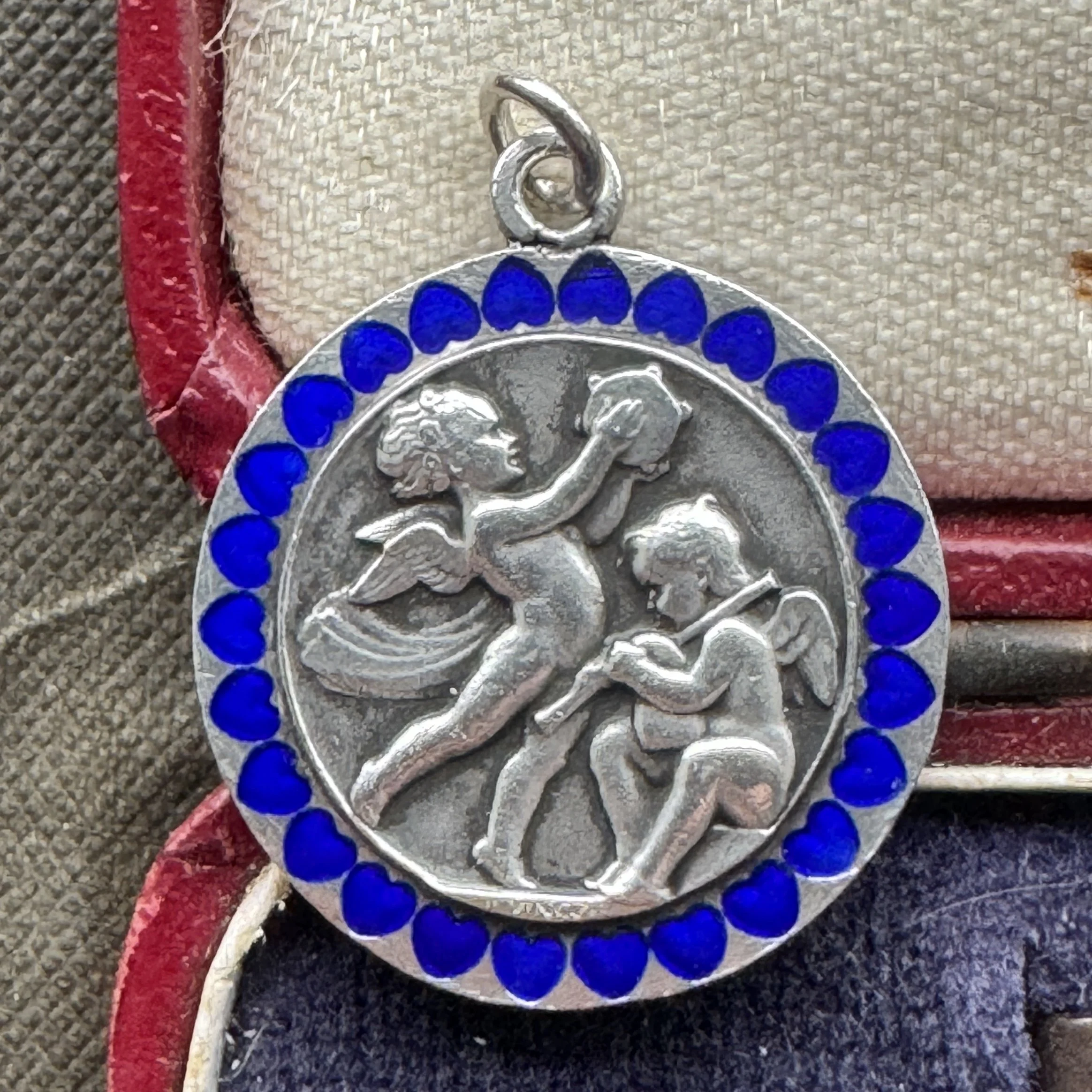 This vintage pendant or charm is made from sterling silver and it’s by Hungarian designer Paul Vincze (14 August 1907 – 5 March 1994). It features apair of cherubs playing musical instruments - one has a tambourine and the other a set of bagpipes. Around the outer edge is a ring of cobalt blue enamelled hearts. There’s a soldered-shut jump ring at the top for hanging and it’s stamped on the back with “P. Vincze. London. Sterling Silver”. This is a rare design of Vincze’s and not one I’ve come across before!