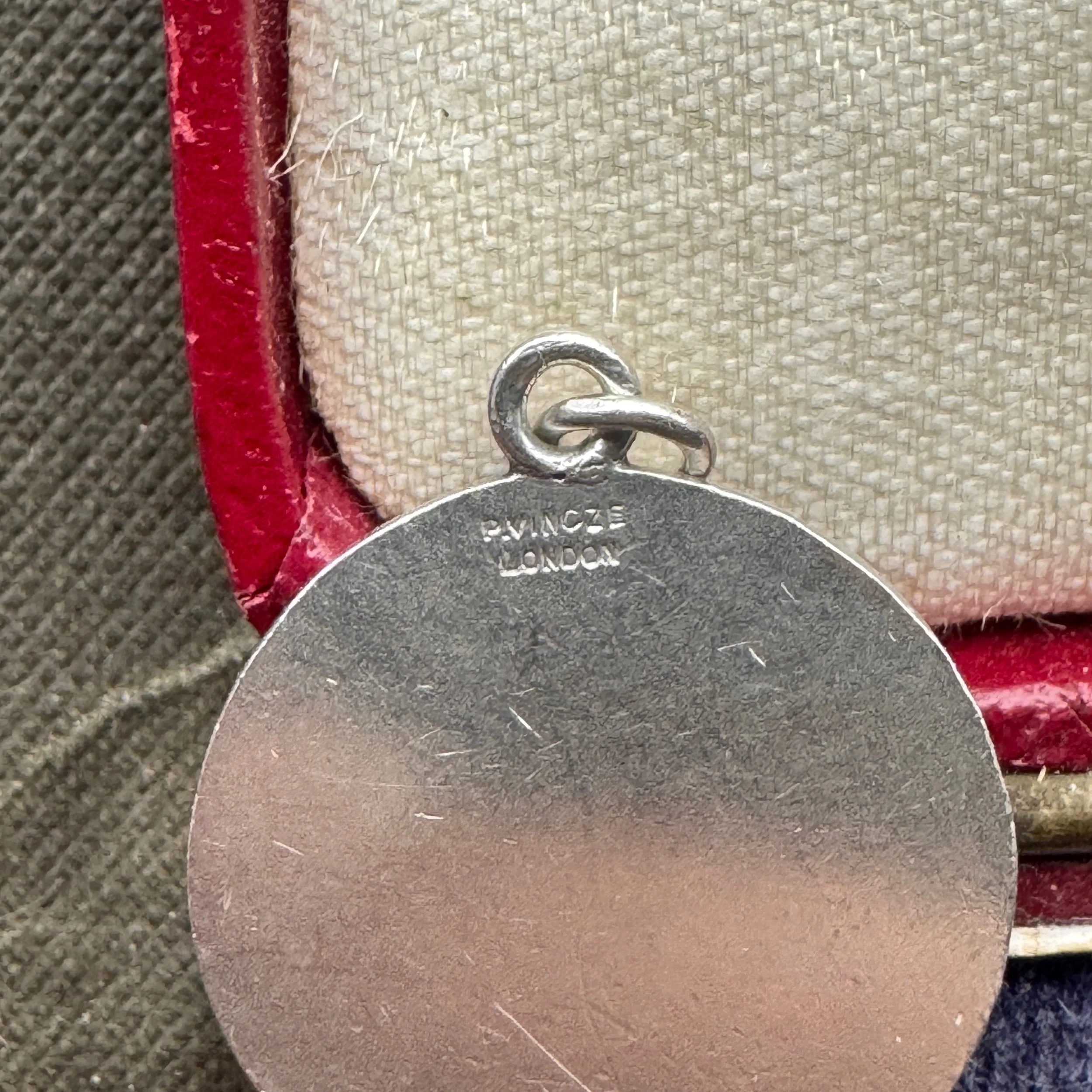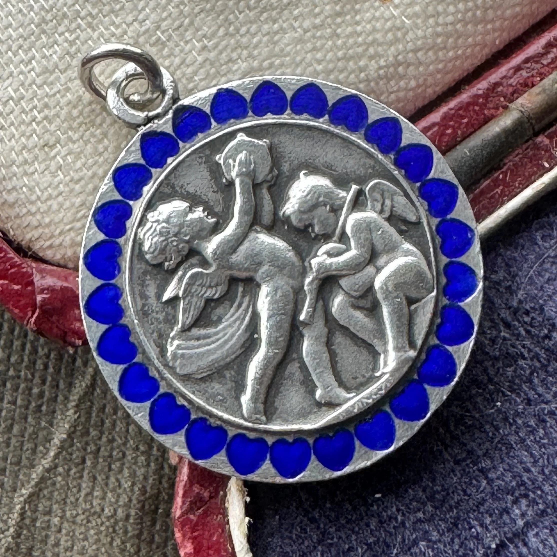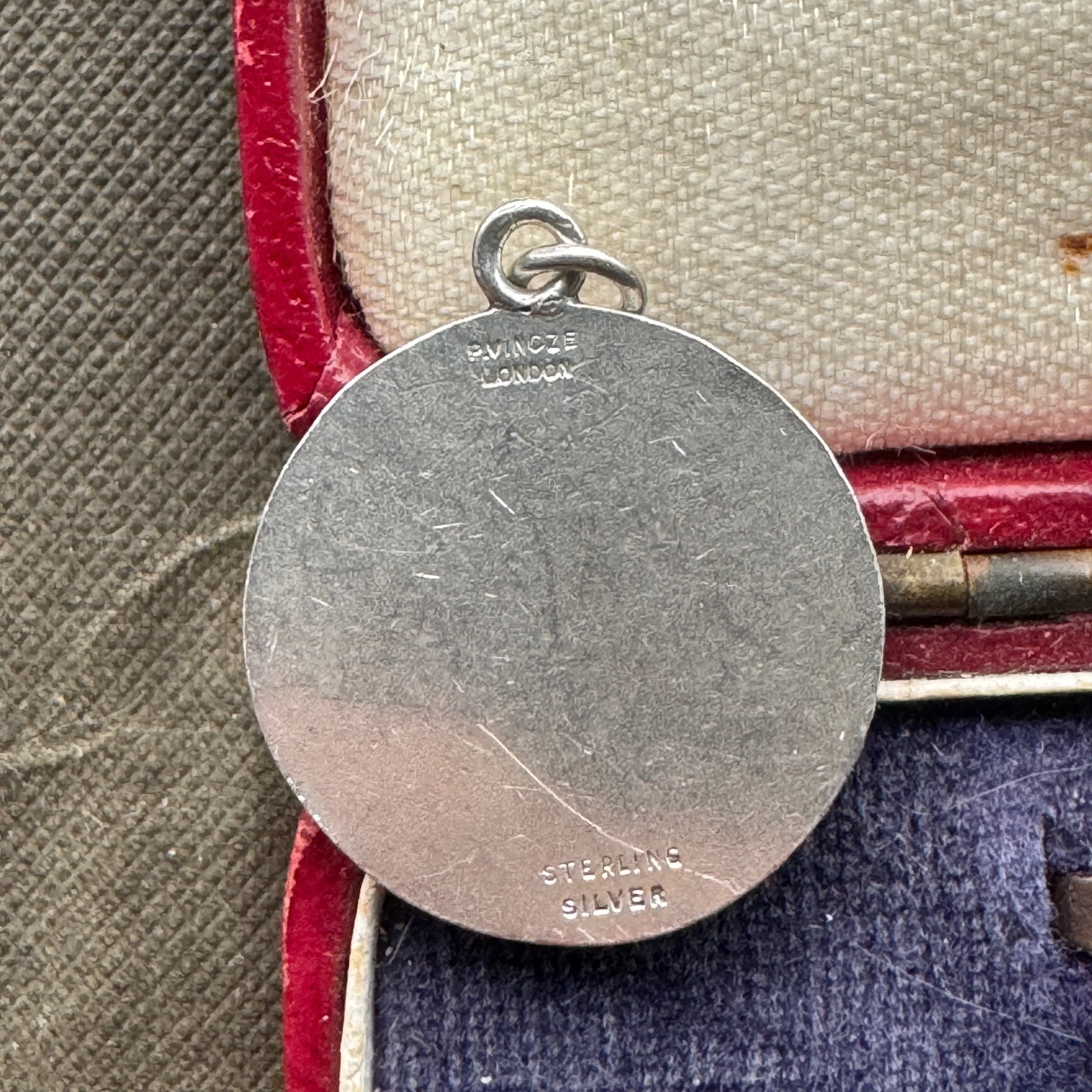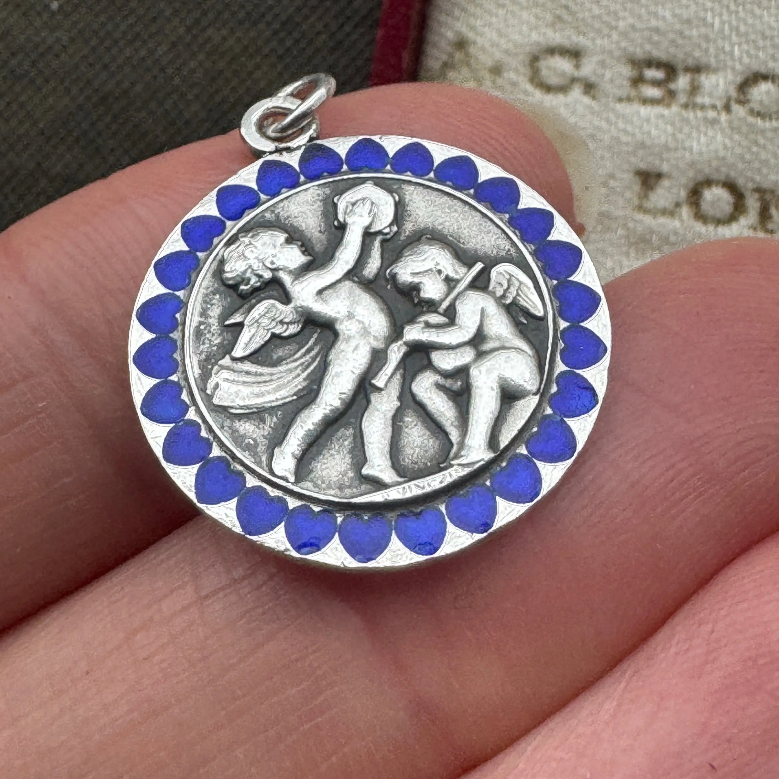 This vintage pendant or charm is made from sterling silver and it’s by Hungarian designer Paul Vincze (14 August 1907 – 5 March 1994). It features apair of cherubs playing musical instruments - one has a tambourine and the other a set of bagpipes. Around the outer edge is a ring of cobalt blue enamelled hearts. There’s a soldered-shut jump ring at the top for hanging and it’s stamped on the back with “P. Vincze. London. Sterling Silver”. This is a rare design of Vincze’s and not one I’ve come across before!