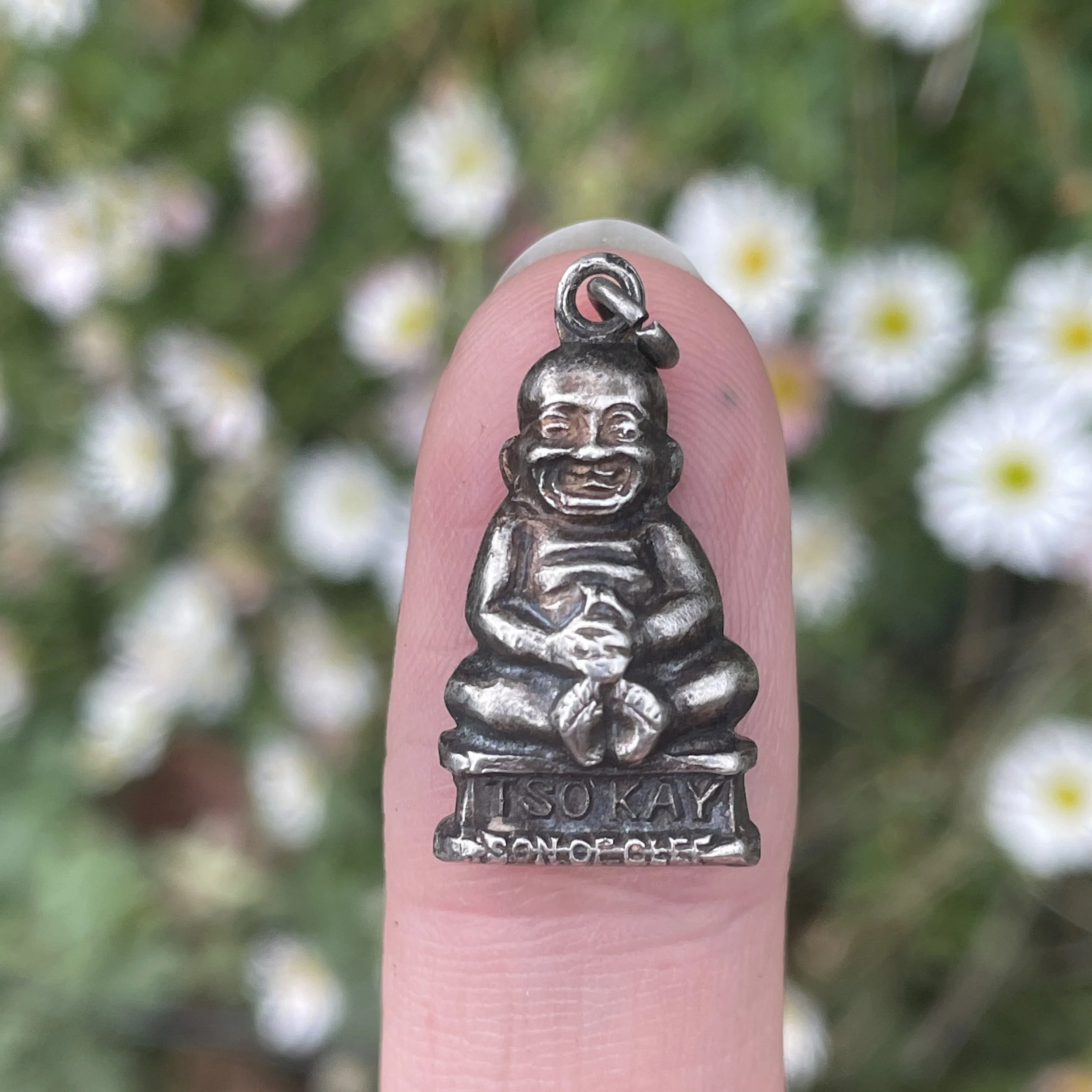 This antique vesta case is made from sterling silver. It was originally designed to be hung from a gentleman’s pocket watch chain, to hold matches to keep them safe and dry (the ridged bit on the base was for striking them), but today you can pop any little keepsake inside. It’s hand engraved all over with an acanthus leaf design and there’s an empty corner on one side for engraving initials. It’s hallmarked on the rim of the lid, from the Chester Assay Office, with the date letter for 1901. There’s a jump ring at the side for hanging.