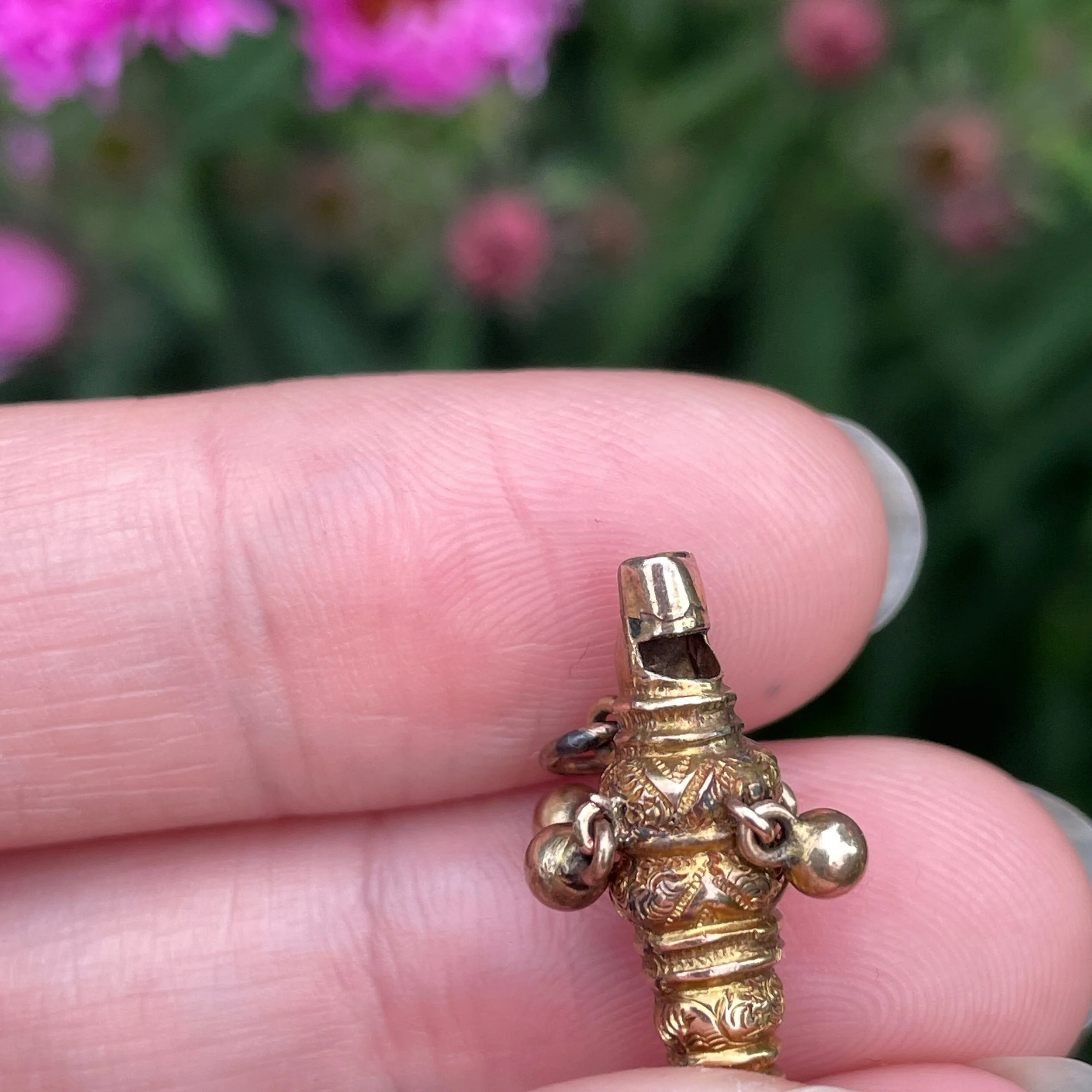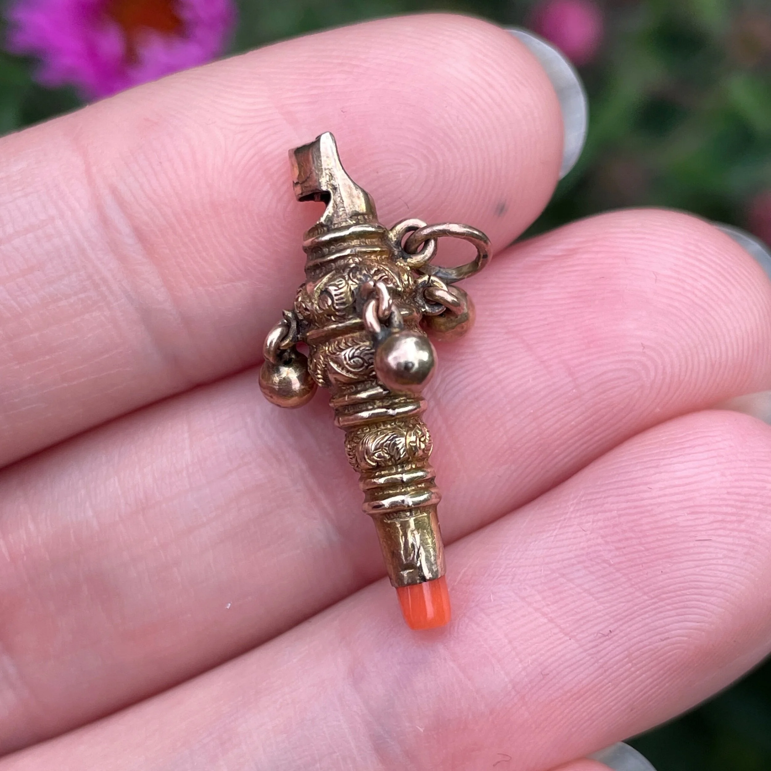 Antique Gold-Cased Baby's Rattle / Working Whistle Pendant with Coral