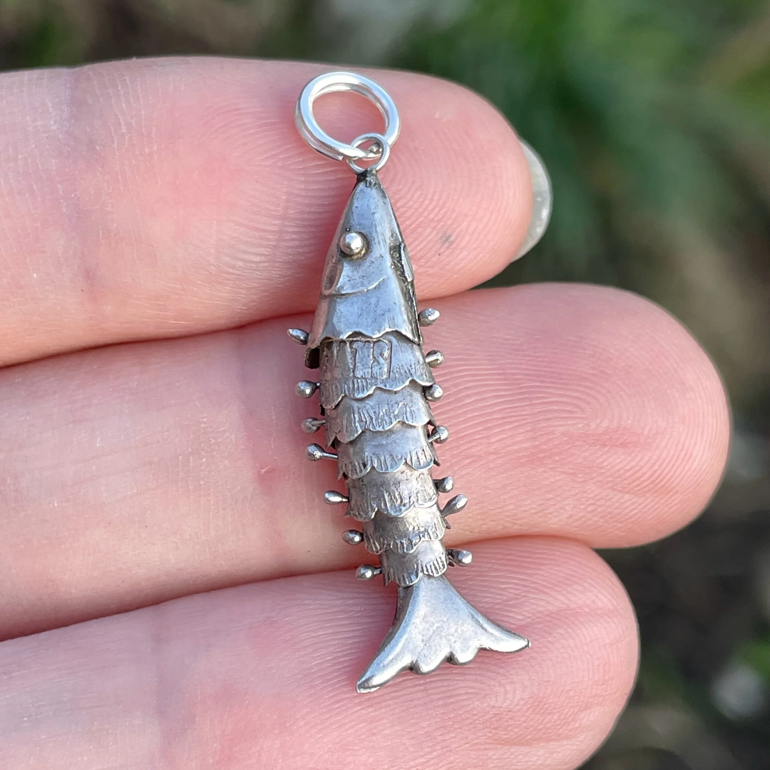 This vintage pendant is made from silver. It’s in the shape of a fish, with detail on both sides, and the tail is jointed so it wiggles about as you wear it. It’s unmarked but acid tests as silver, and there’s a small split ring at the top for hanging.