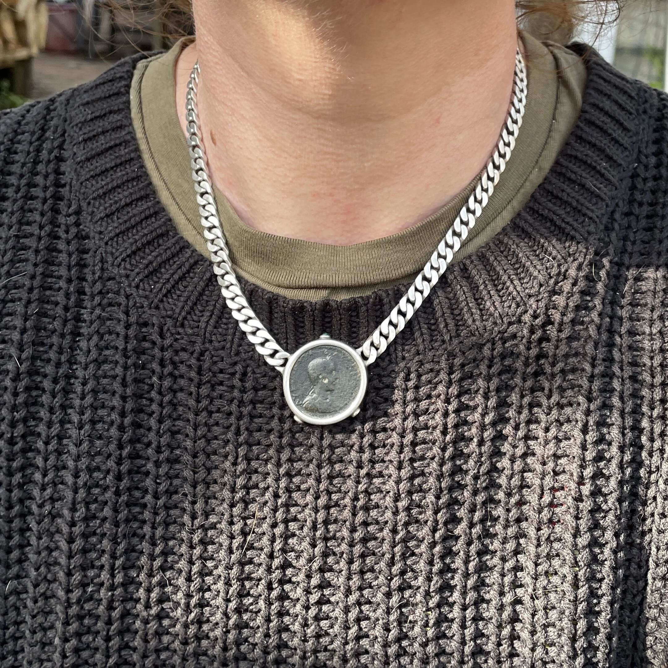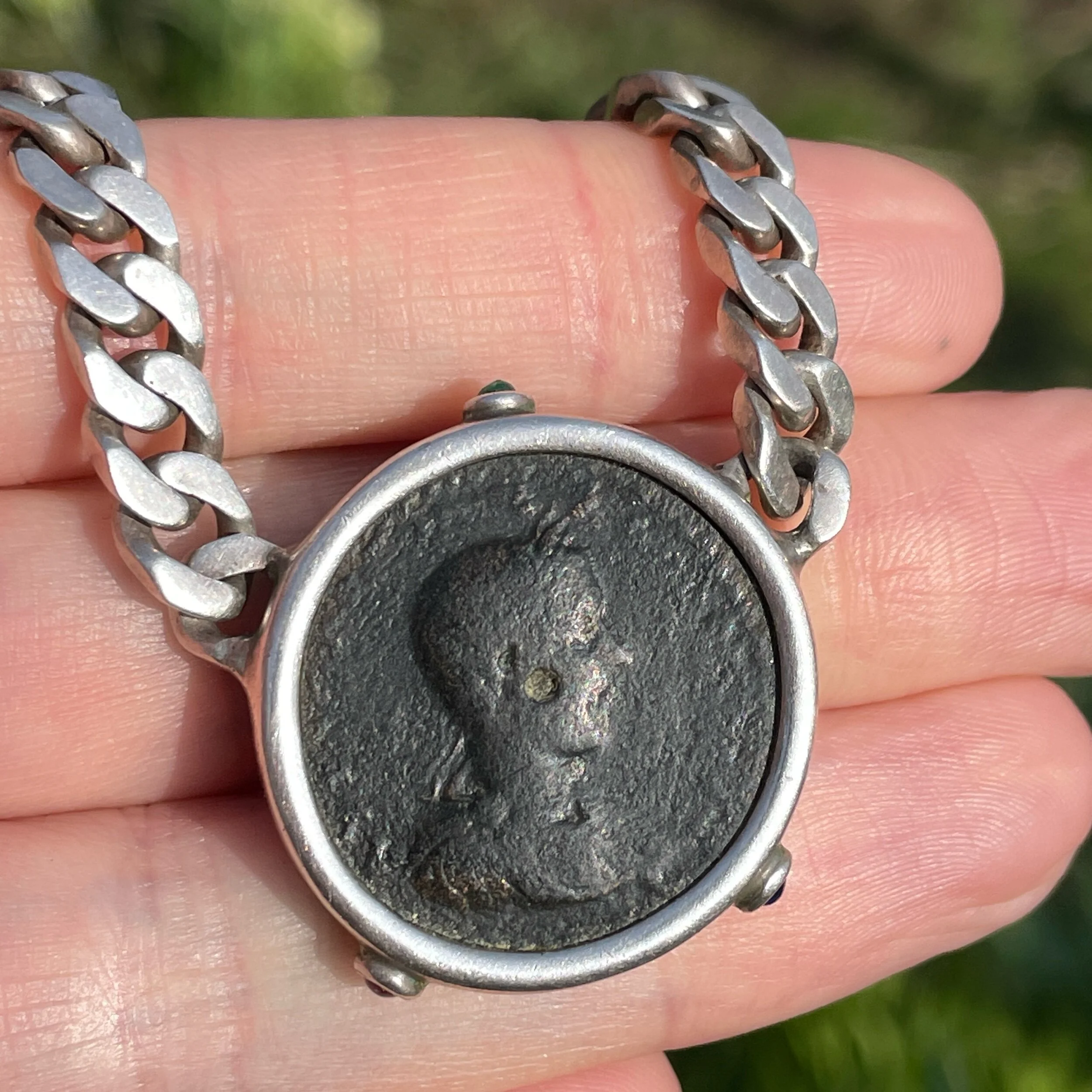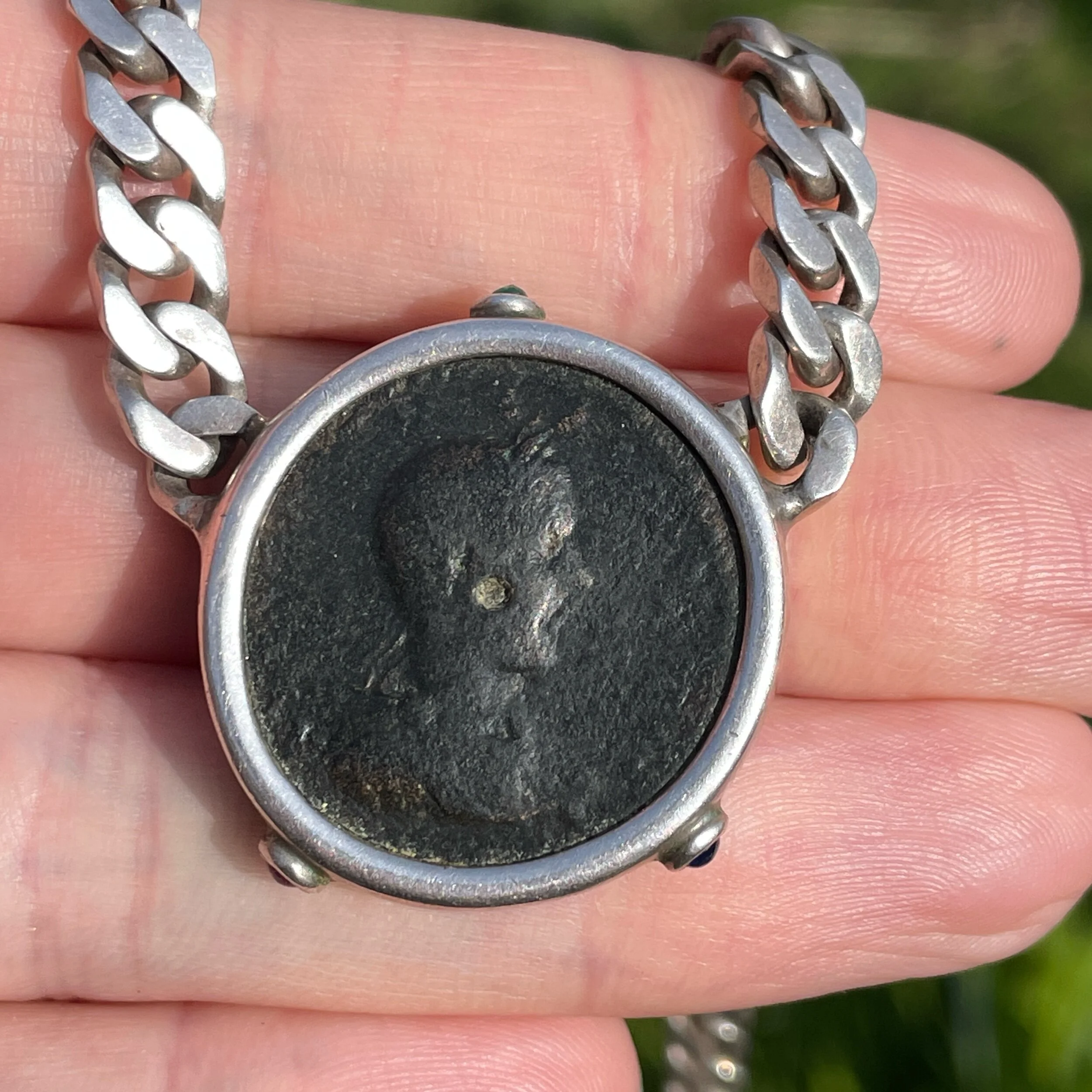 This vintage necklace is made of sterling silver and featuring a large ancient Roman bronze coin. The coin, which features the head of an emperor on the visible side and a horse and rider on the back, sits within a heavy bezel. The bezel is set with 3 little cabochon stones around the outside; these test as ruby, sapphire and emerald, though they may be lab-made. The pendant hangs from a substantial sterling curb link chain and it fastens with a large trigger clasp which is stamped 925. There are no maker’s marks that I can spot though this is certainly a studio made piece.