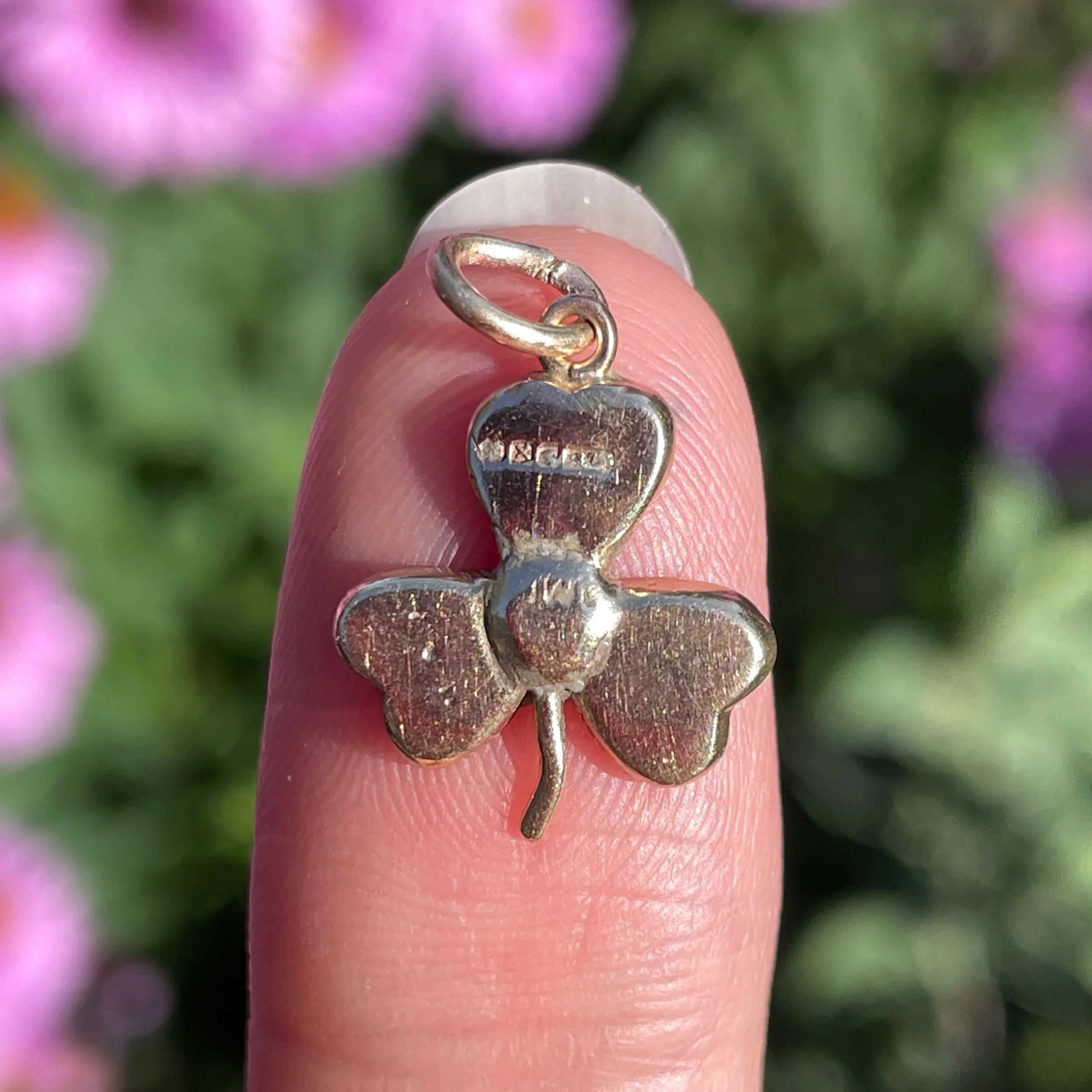 This vintage charm or pendant is made from 9ct yellow gold. It’s shaped like a shamrock, with slices of Connemara marble in the leaves. There’s a full hallmark on the back, it’s tricky to make out but I think it’s the Dublin Assay Office, with the date letter for 1965.