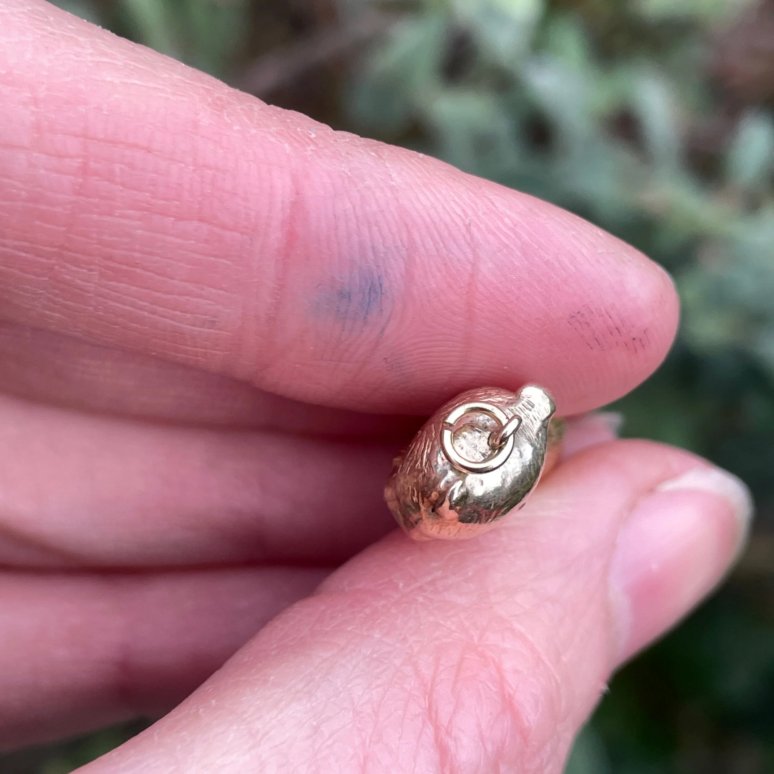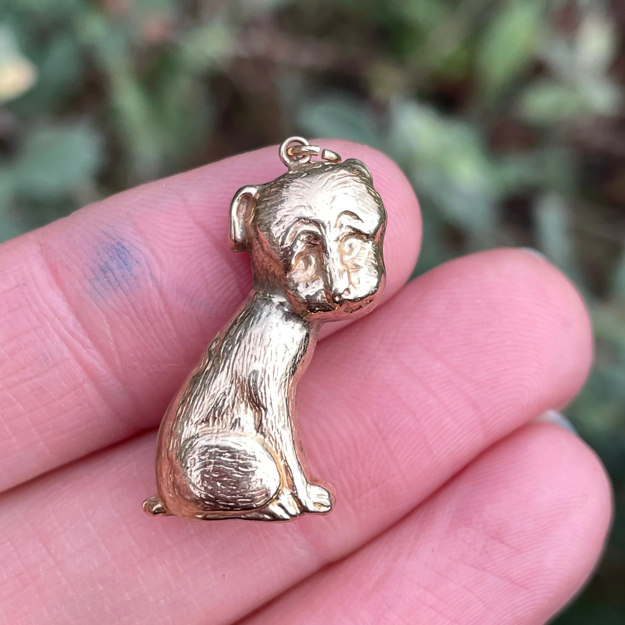 This vintage charm or pendant is made from 9ct yellow gold. It depicts a bashful looking puppy dog. It’s puffy so is hollow and it has detail on both the front and back. It’s fully hallmarked on the back, from the London Assay Office, with the date letter for 1975. There’s a small split ring at the top for hanging.