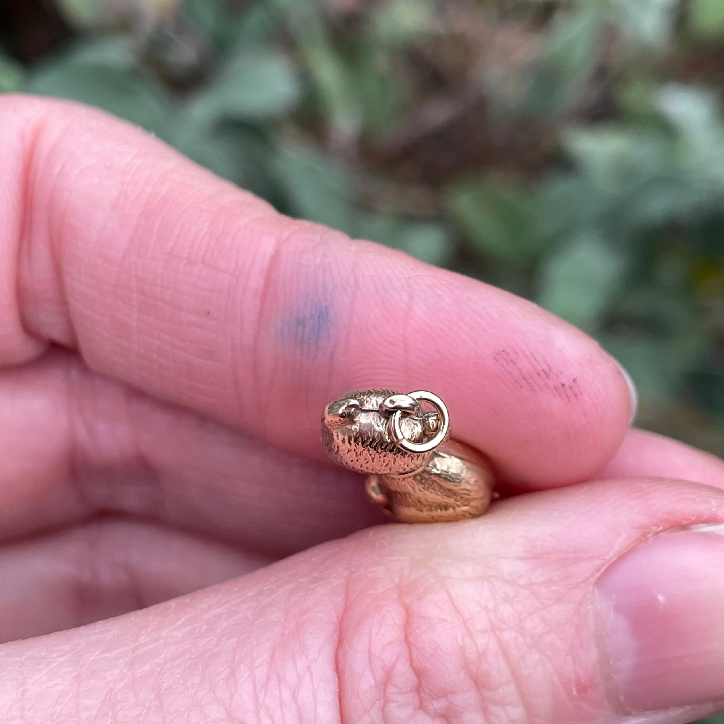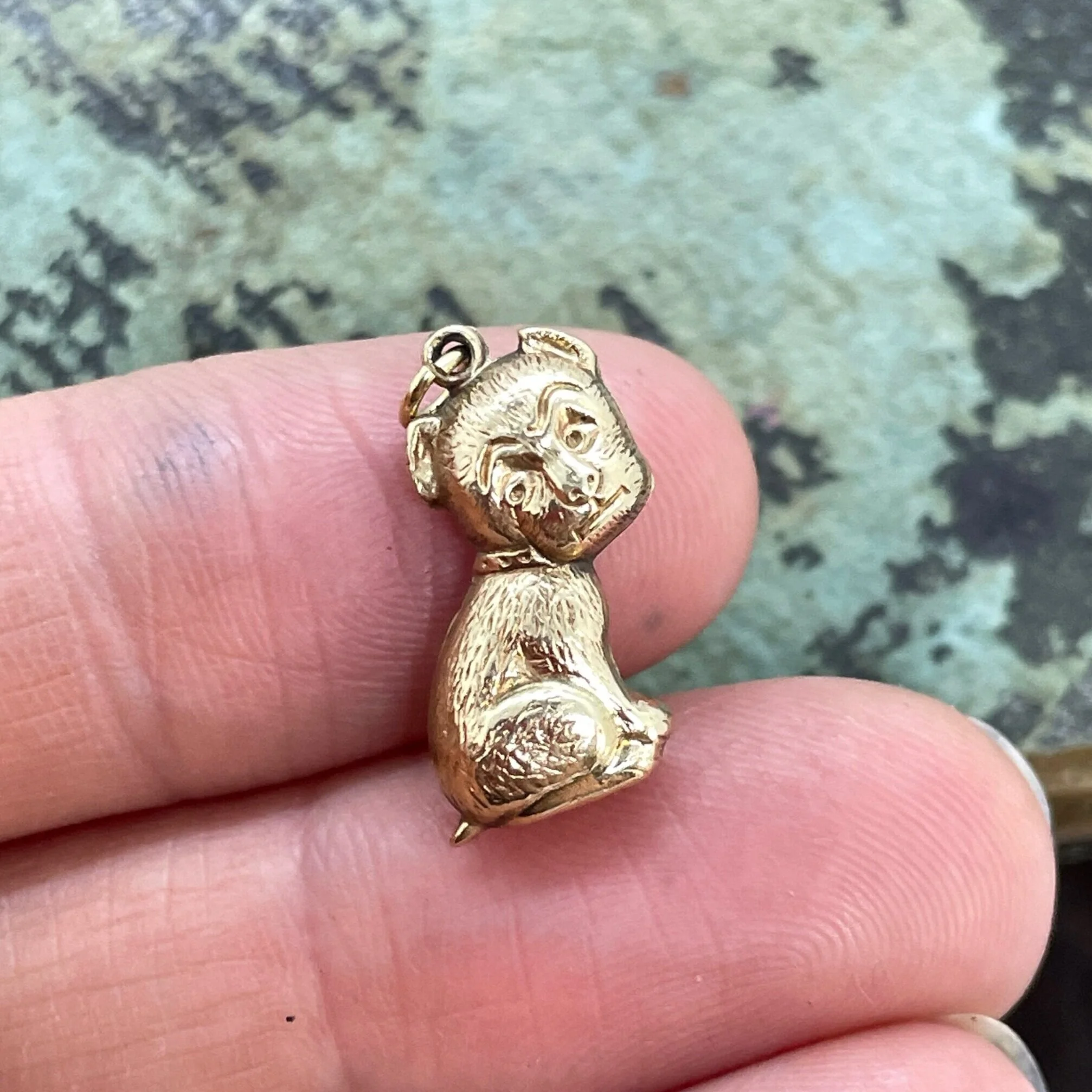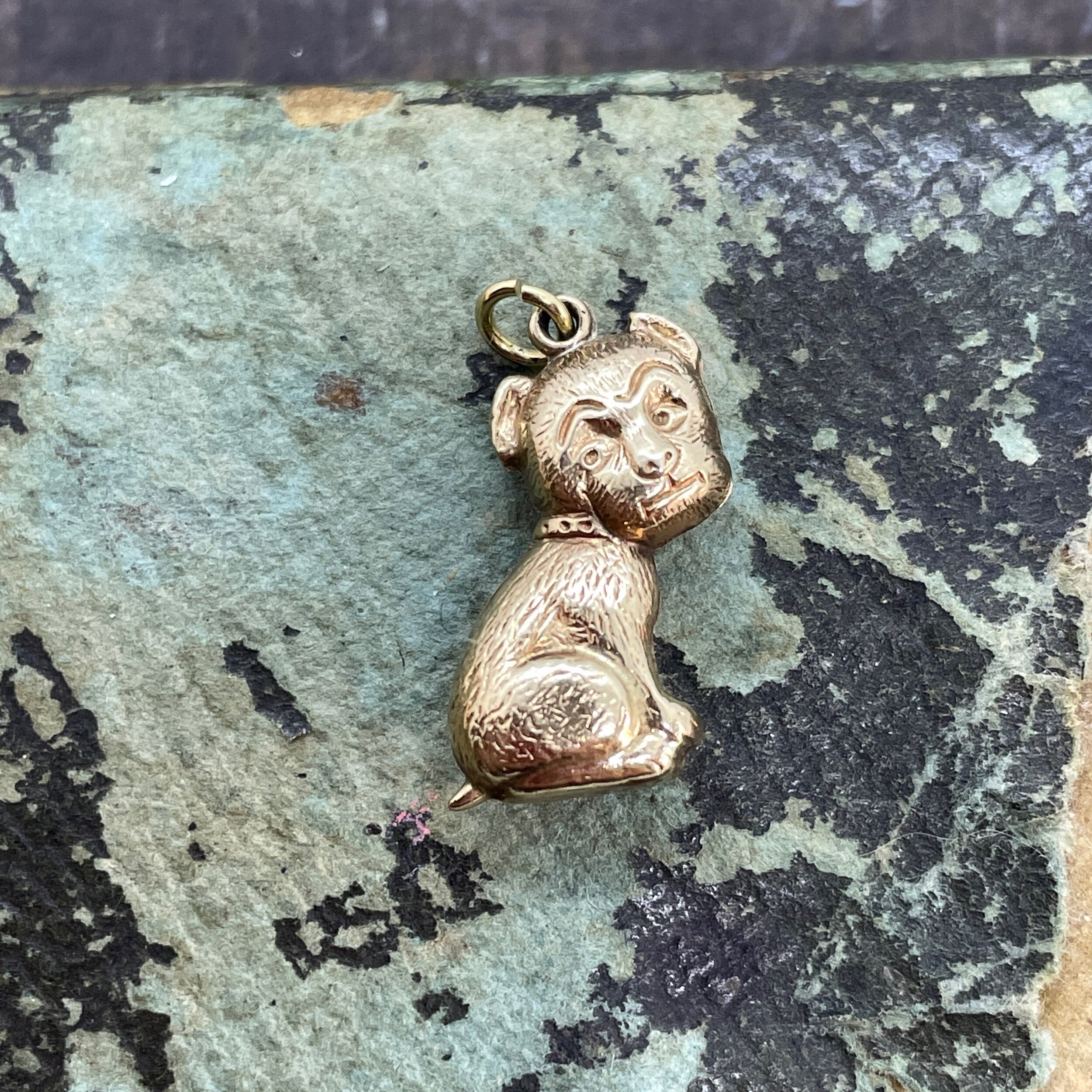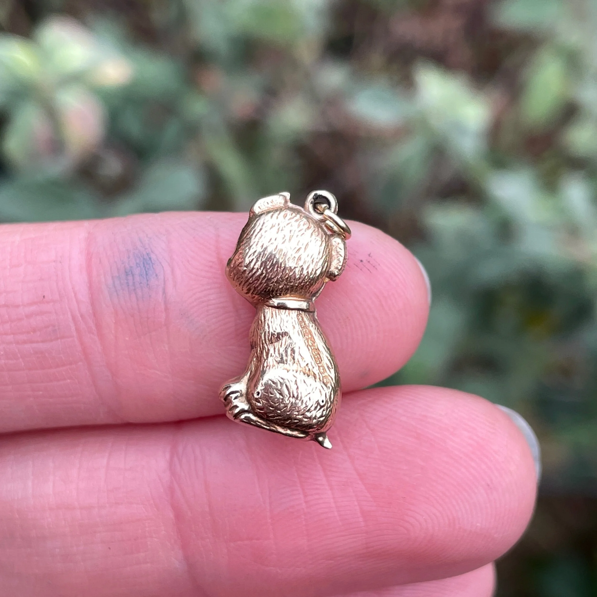 This vintage charm or pendant is made from 9ct yellow gold. It depicts a bashful looking puppy dog. It’s puffy so is hollow and it has detail on both the front and back. It’s fully hallmarked on the back, from the Birmingham Assay Office. The date letter’s tricky to make out but it’ll be the late 1960s/early 1970s. There’s a small split ring at the top for hanging.
