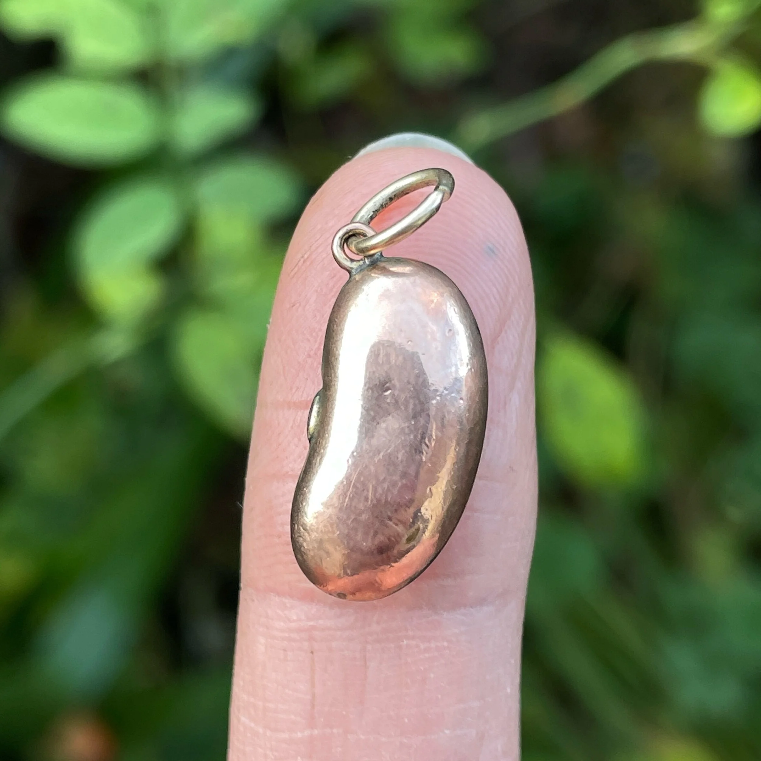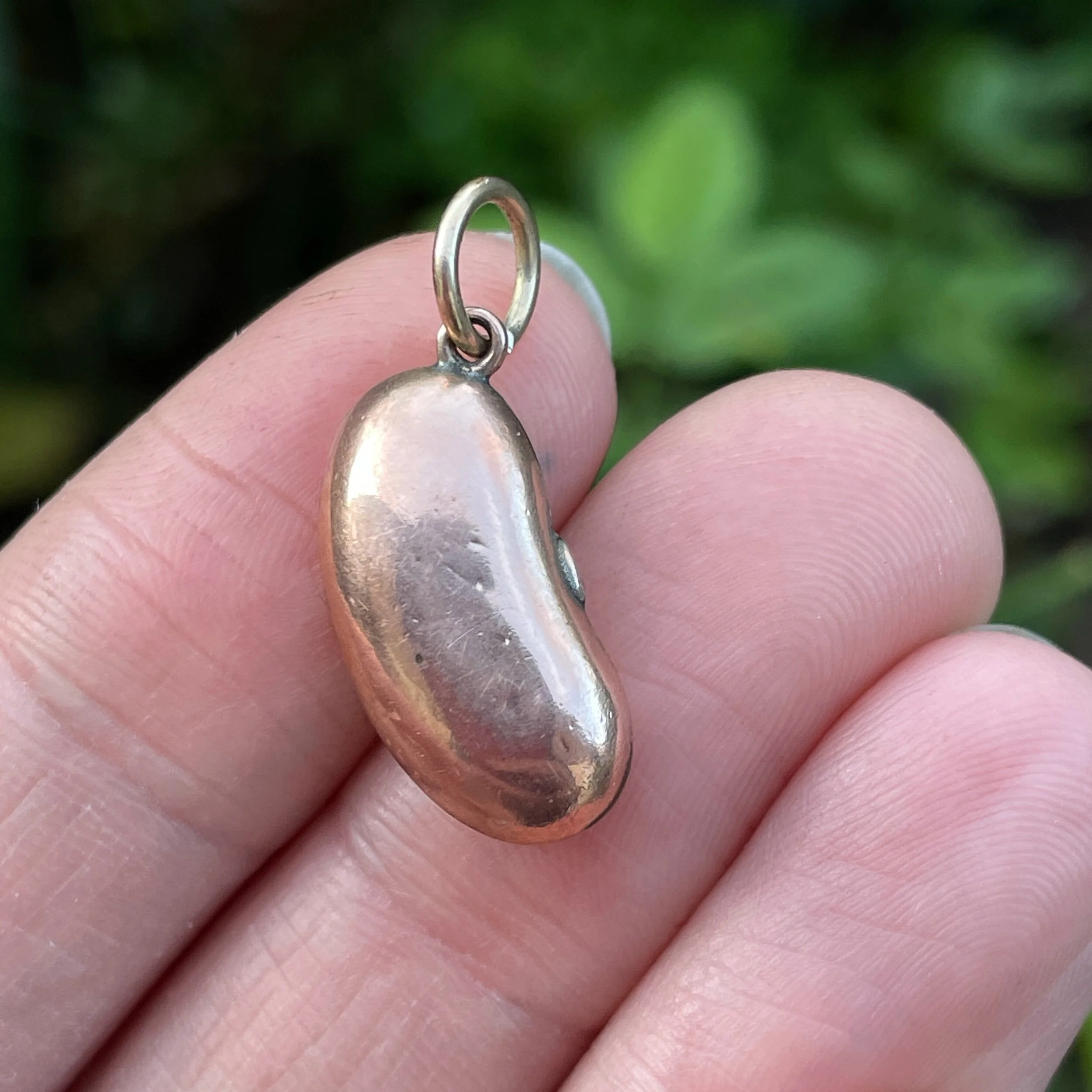 This antique pendant or charm is made from 9ct rose gold. It’s puffy, so hollow rather than solid and there’s a small airhole in the side (a remnant of the making process). There’s a large split ring at the top for hanging and the bean is unmarked but acid tests as 9-12ct. It was cut from an Edwardian (1903) 9ct charm bracelet and dates from this era.