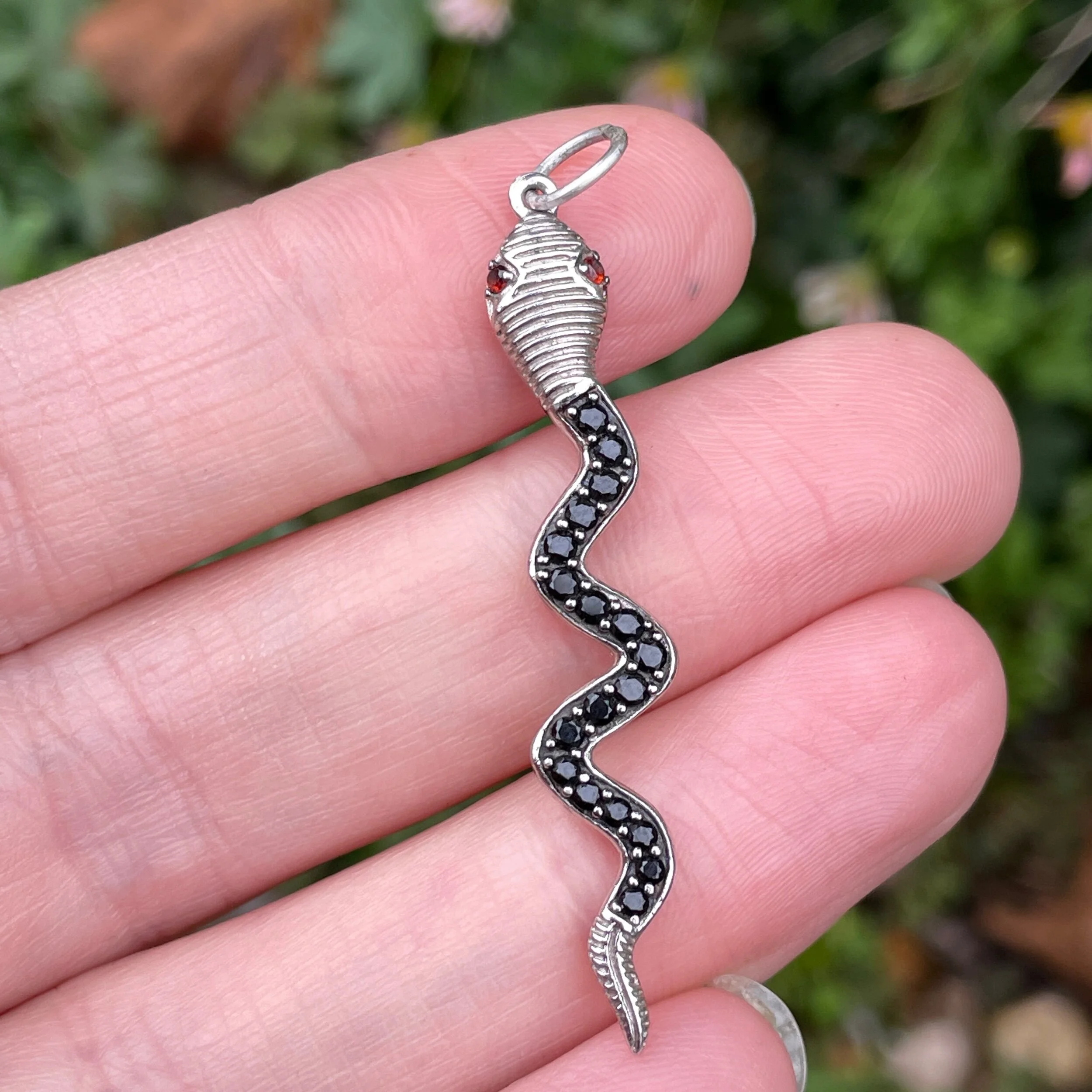 This pre-owned pendant is made from sterling silver. It;s set with garnet eyes and what appear to be black spinels down it’s back. It has a soldered closed ring at the top for hanging and the back is stamped 925 for sterling silver, along with the maker’s initials.