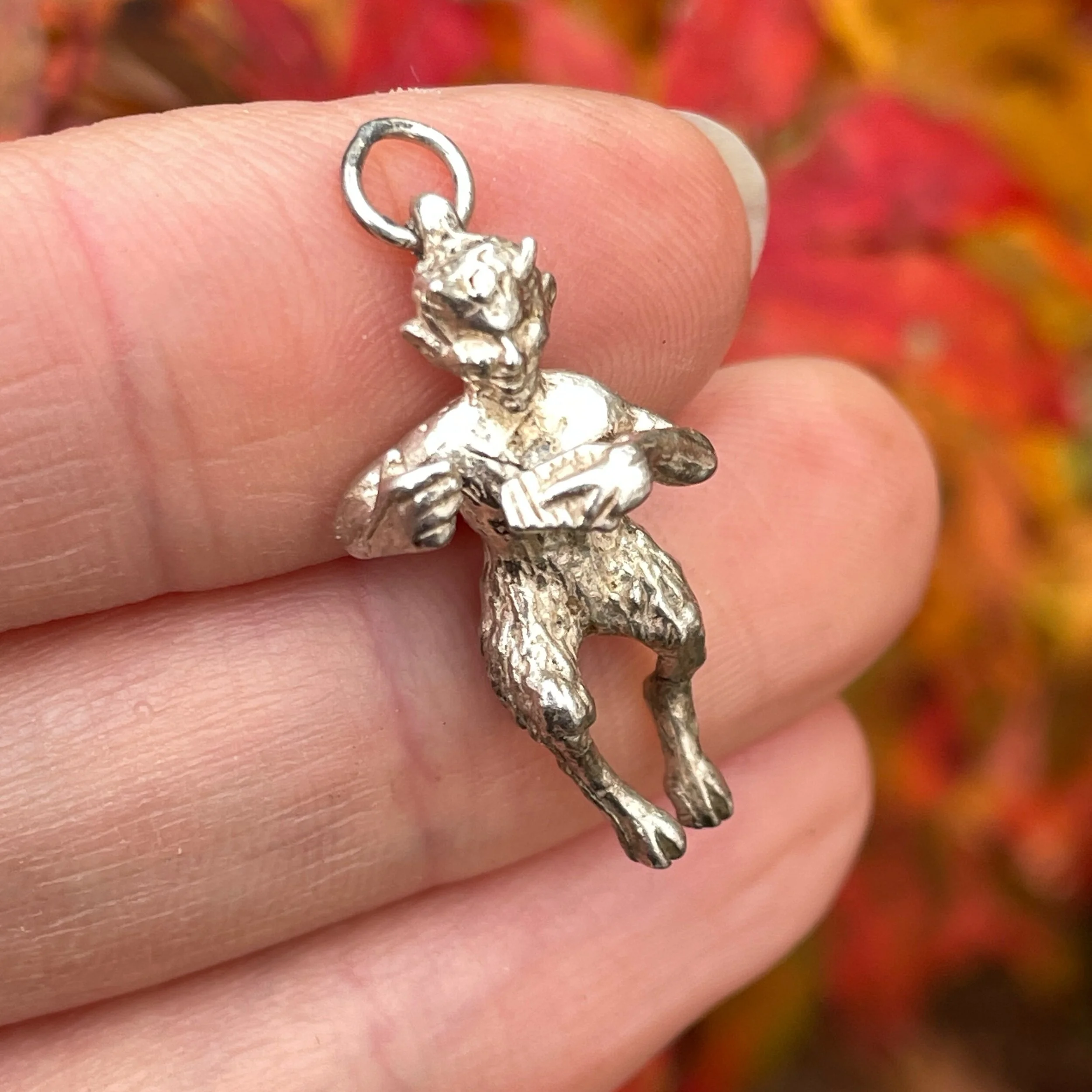 This vintage pendant is made from silver. It depicts Pan, playing his pipes. It’s nicely detailed, you can clearly make out his face, horns, the fur on his legs and his little cloven hooves. There’s a split ring at the top for hanging (due to the orientation of the bale he would hang sideways if you wore him on a necklace unless you add another split ring). He’s unmarked but acid tests as silver.