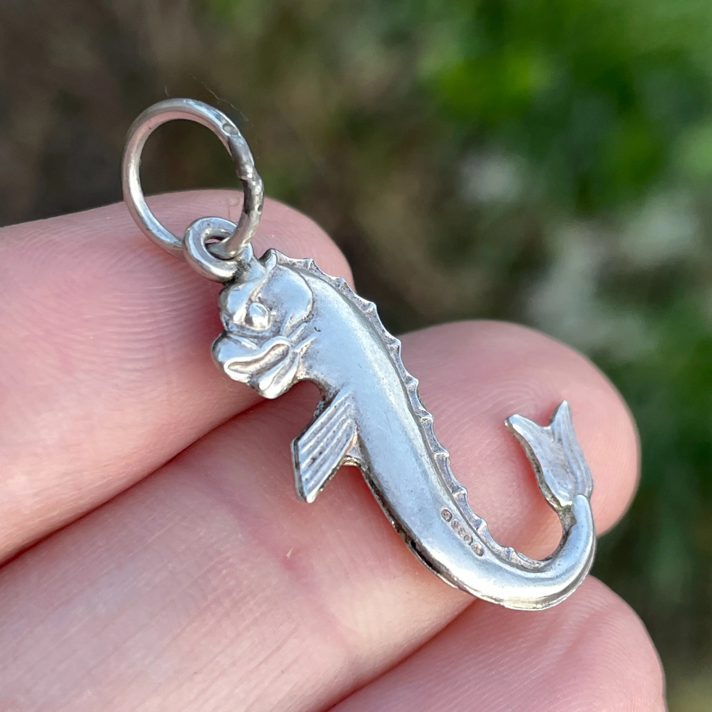 This vintage pendant is made from sterling silver. It depicts a mythical fish or dolphin, with detail on both sides. It’s stamped 925 on one side and what I think are Maltese hallmarks on the other. There’s a large soldered shut ring at the top for hanging.