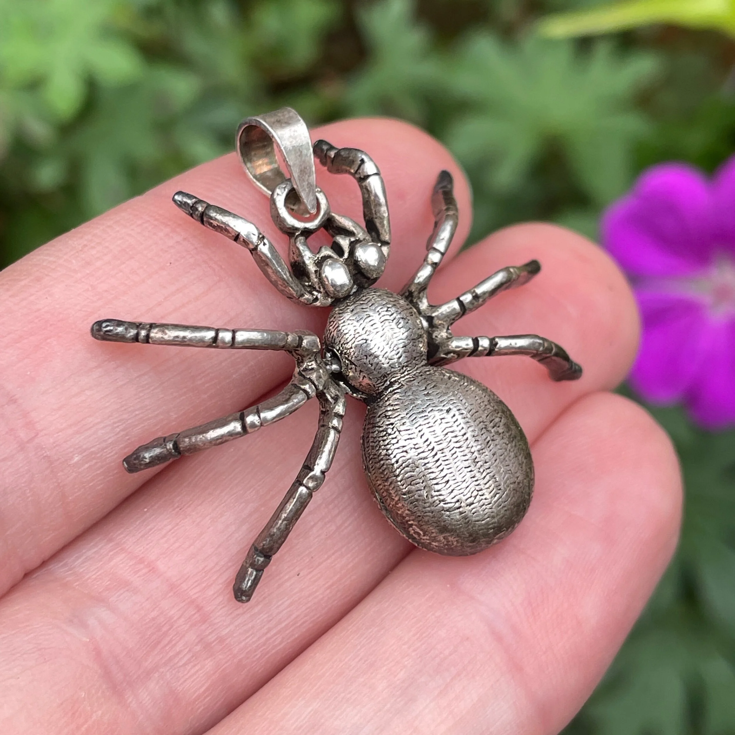 This pre-owned pendant is made from sterling silver. It ‘s in the shape of a spider and 3 of the legs on either side are articulated so wiggle about. It’s stamped 925 on the back and has a large bale for hanging.