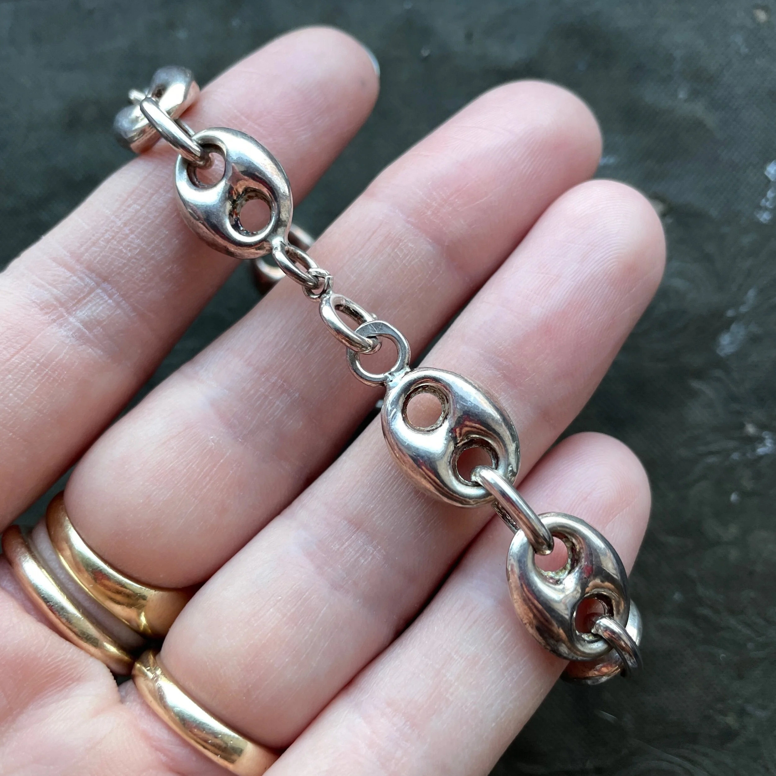 This vintage bracelet is made from sterling silver. It features a semi-solid anchor link, with a bolt ring clasp. It has Italian hallmarks by the clasp and is also stamped 925S on the clasp itself.