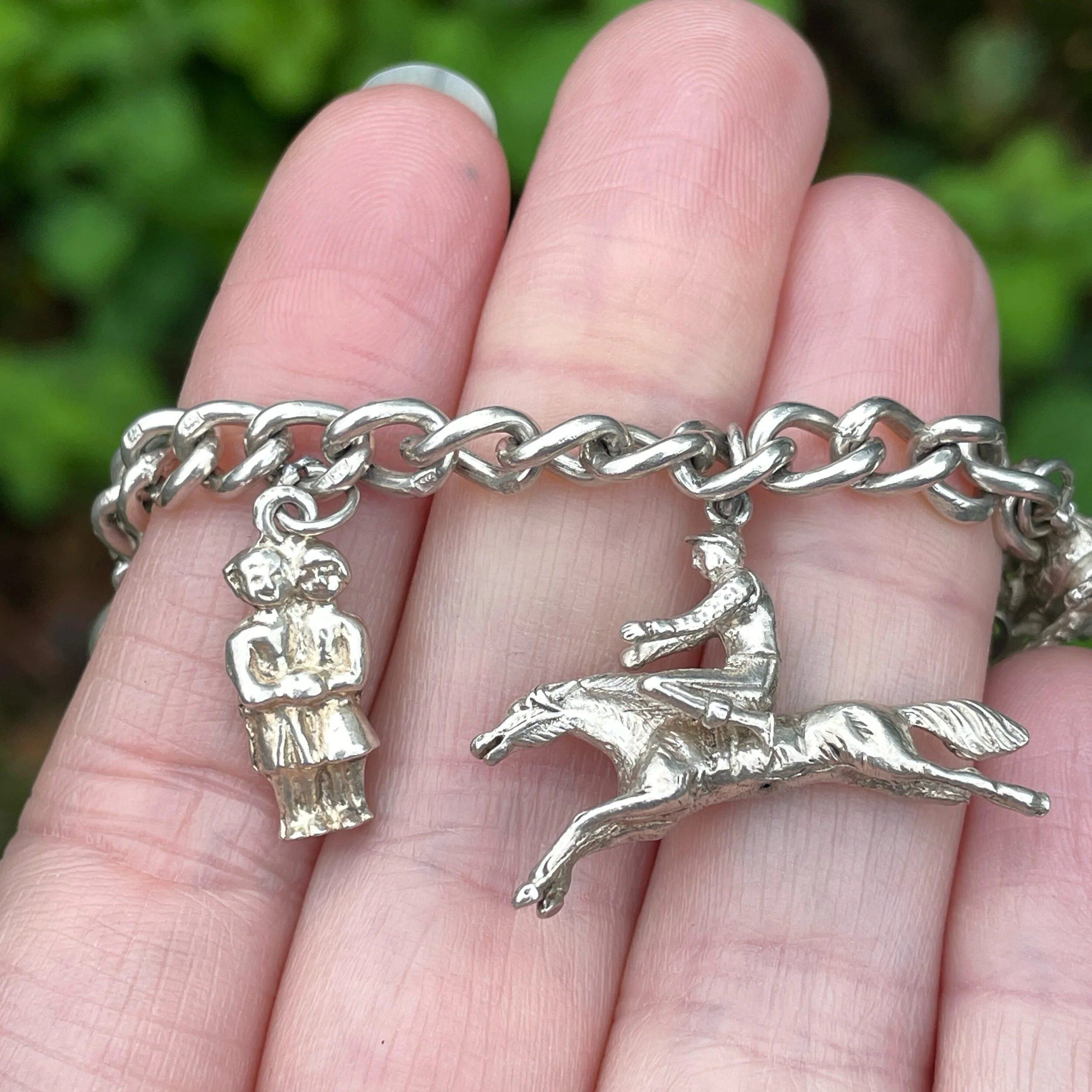 1955 Vintage Sterling Silver Charm Bracelet - Padlock Clasp and 9 Charms - 36 Grams