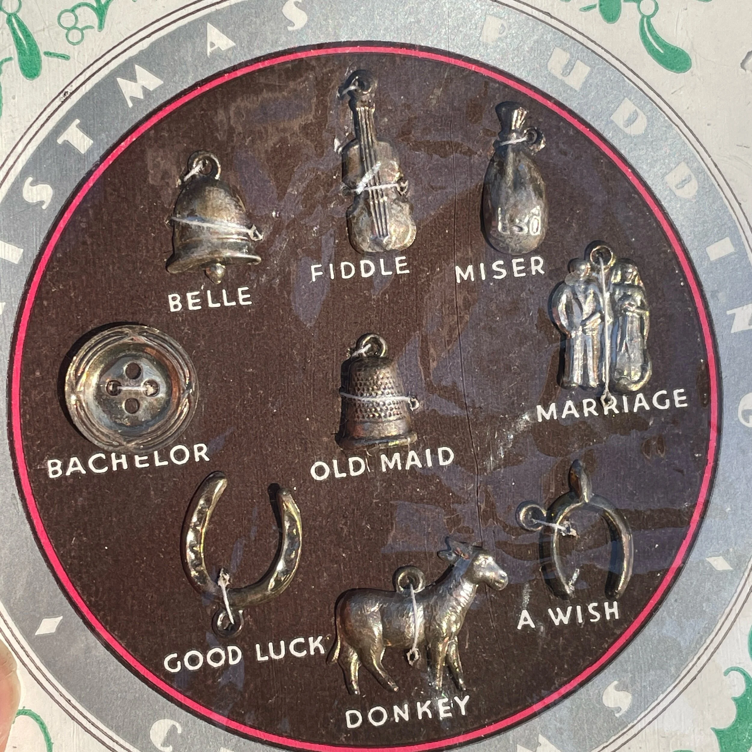 This vintage set of Christmas pudding charms are made from sterling silver. They date from 1930-1940 and they are unused and still attached to their original display card, within the original cellophane and paper outer wrapper. Each charm is held on the card with white thread.