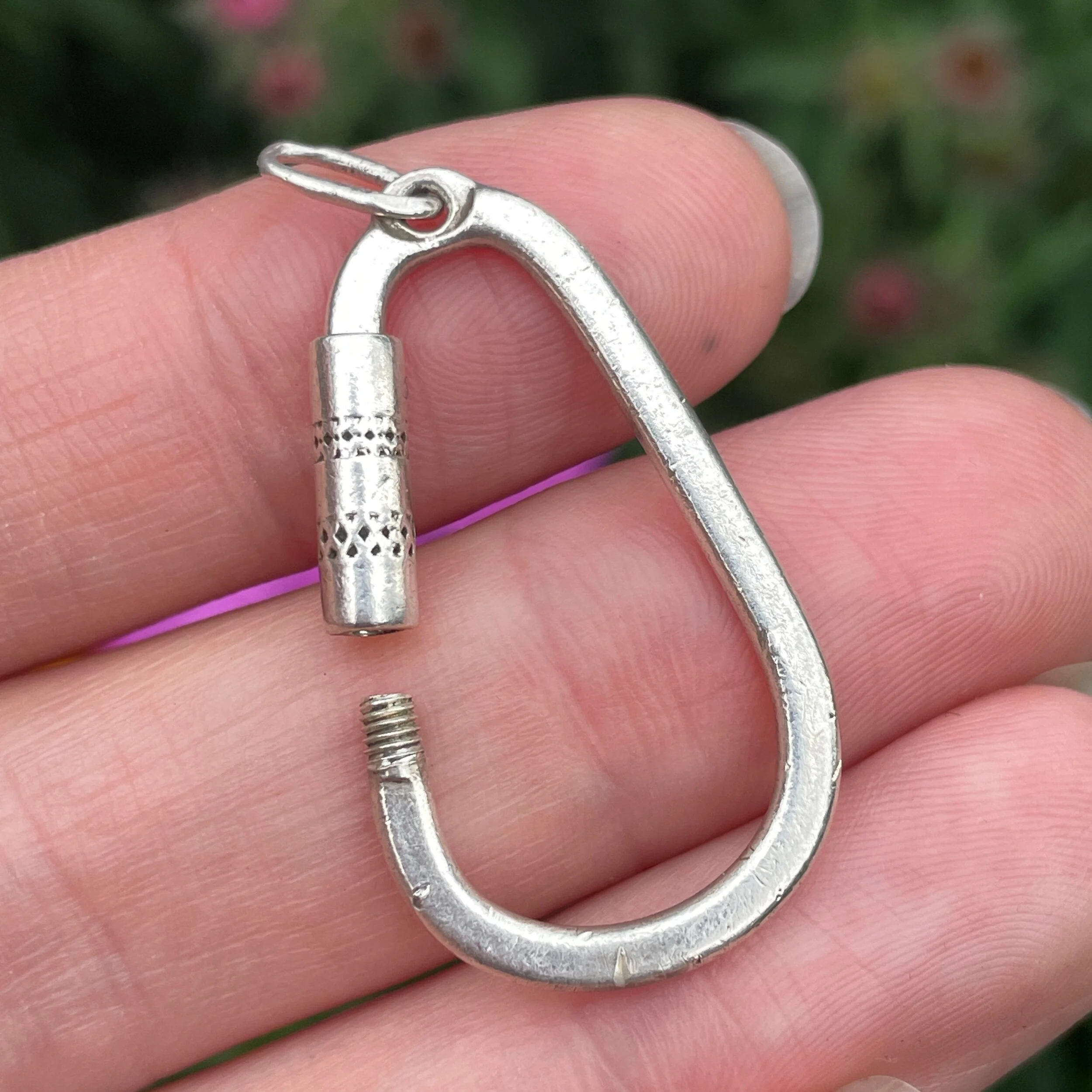 This vintage pendant is made from sterling silver. It was originally designed to be a keyring, but these make perfect charm holders! There’s a loop at the top for hanging on a chain and then you unscrew the central barrel and slip your charms on the loop and screw it shut, safe and sound! There are no stamps on this one, which is quite normal for these as it was often the main fob of the keyring which was hallmarked, but it acid tests as sterling silver.