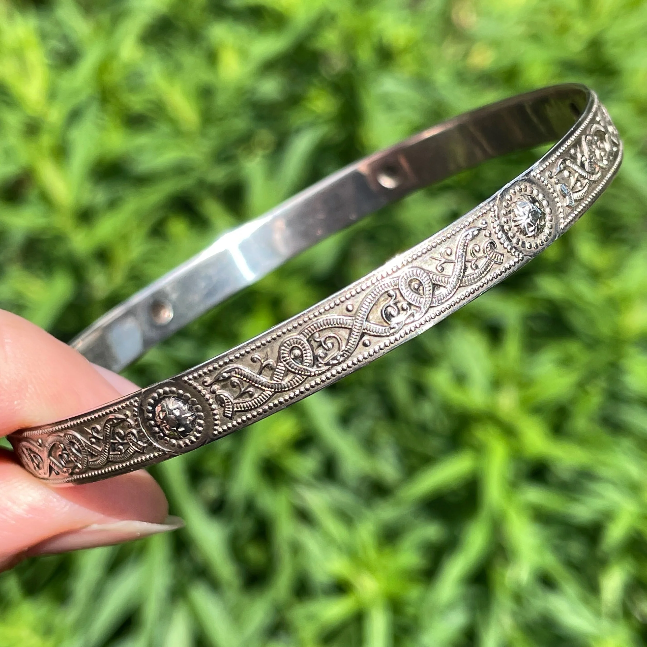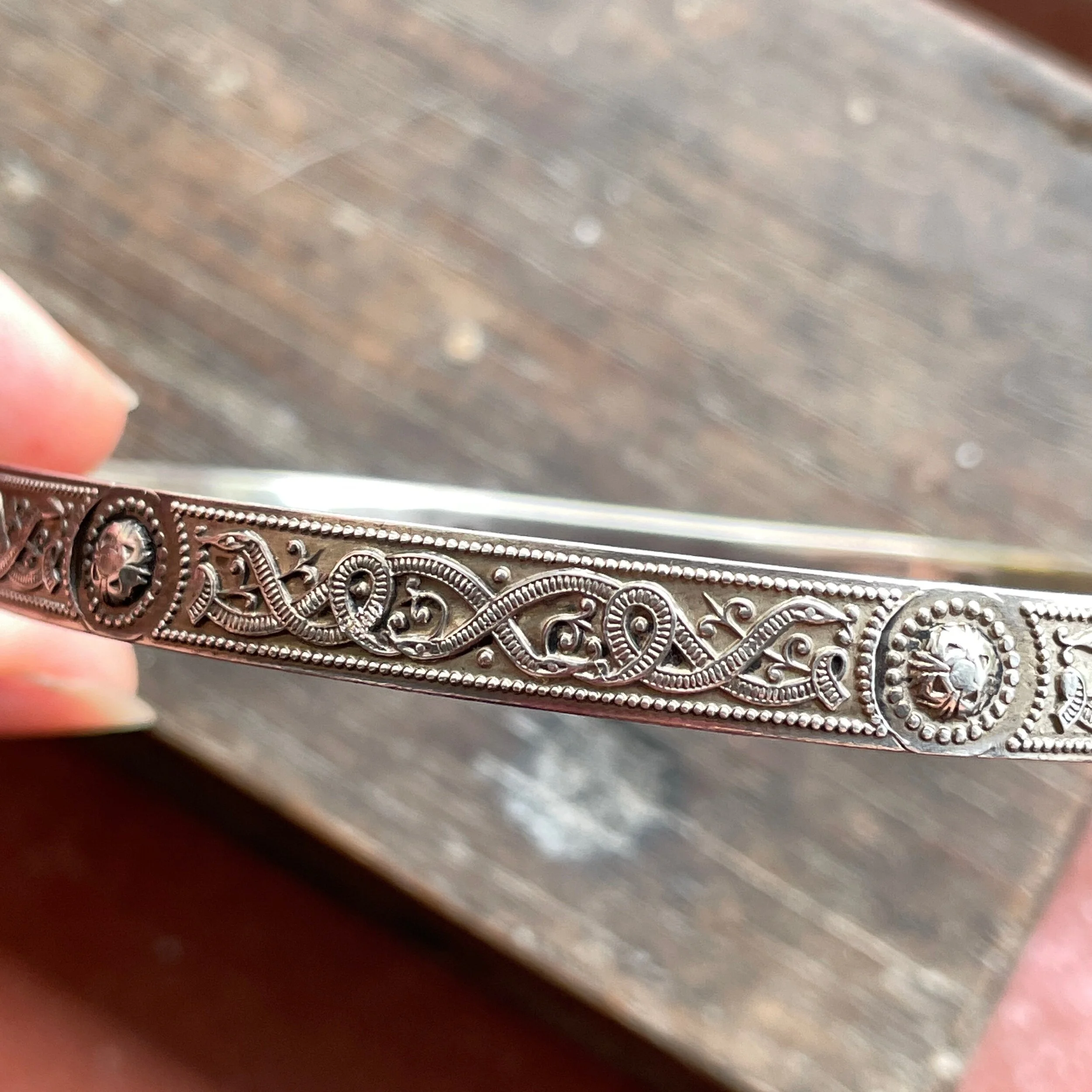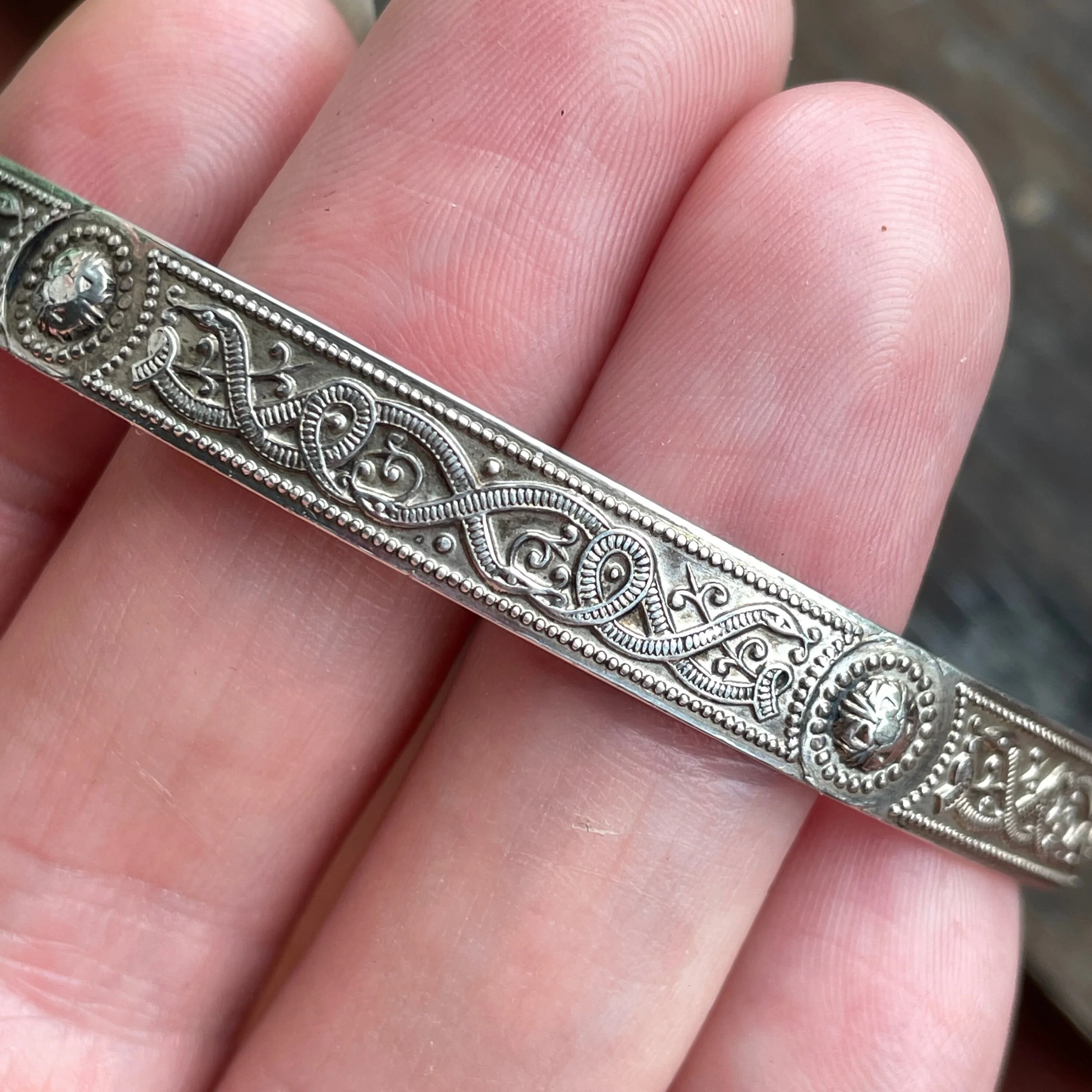 This vintage bracelet is made from sterling silver. It features a pattern inspired by the Ardagh Chalice around the outside, depicting zoomorphic creatures which form Celtic knots, and this design goes all the way around. It’s hallmarked on the inside for sterling silver, from the Sheffield Assay Office, with the date letter for 1982.