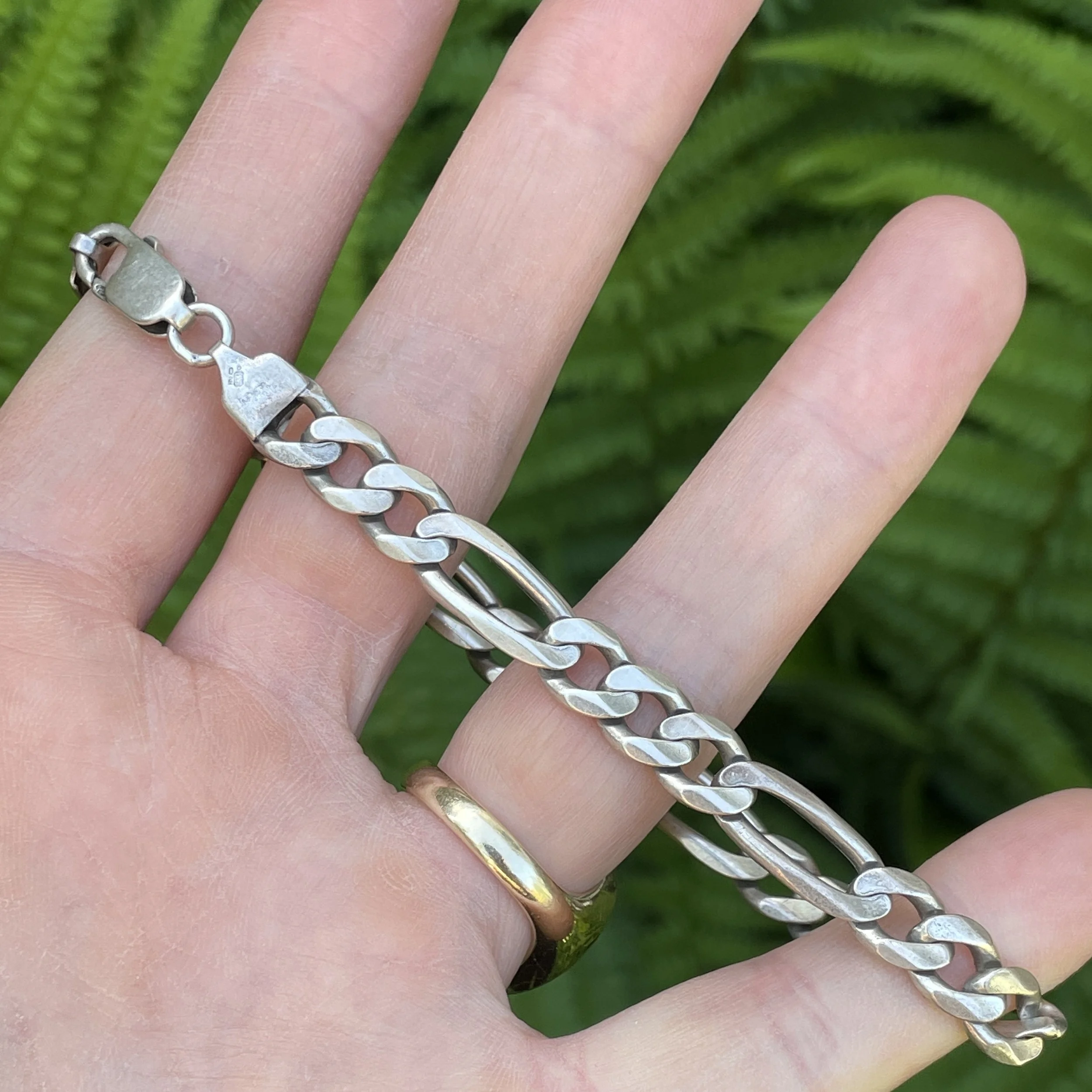 This vintage Italian sterling silver bracelet features a figaro curb link chain and it fastens with a sturdy trigger clasp. It’s got a full UK import hallmark by the clasp, although they’re tiny and tricky to make out. It’s also stamped “Italy”.