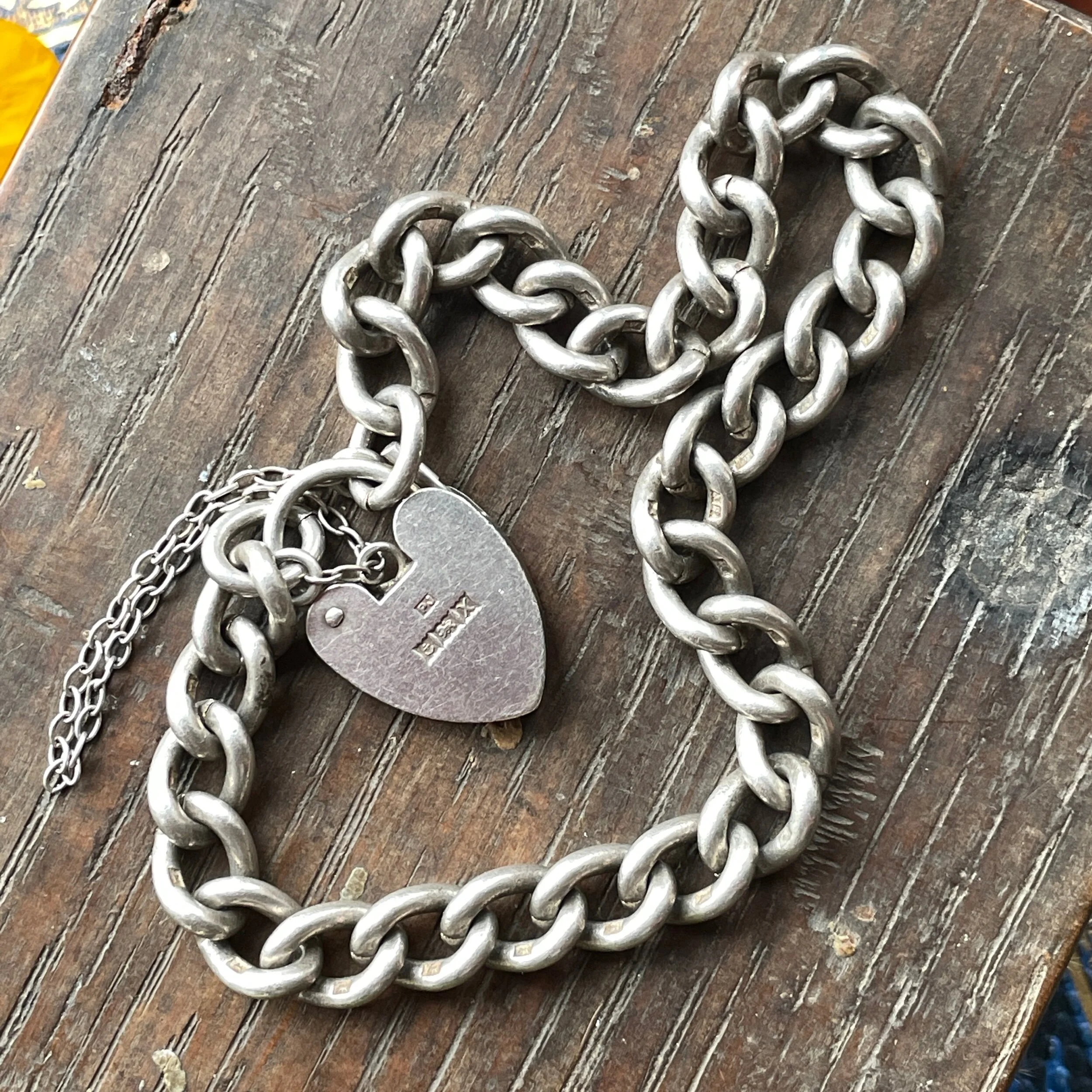 This vintage sterling silver bracelet features a sturdy curb link, fastening with a heart shaped padlock clasp, with a safety chain connected. The chain has a hallmark stamp on every link and the padlock has a full hallmark, from the Birmingham Assay Office, with the date letter for 1972.