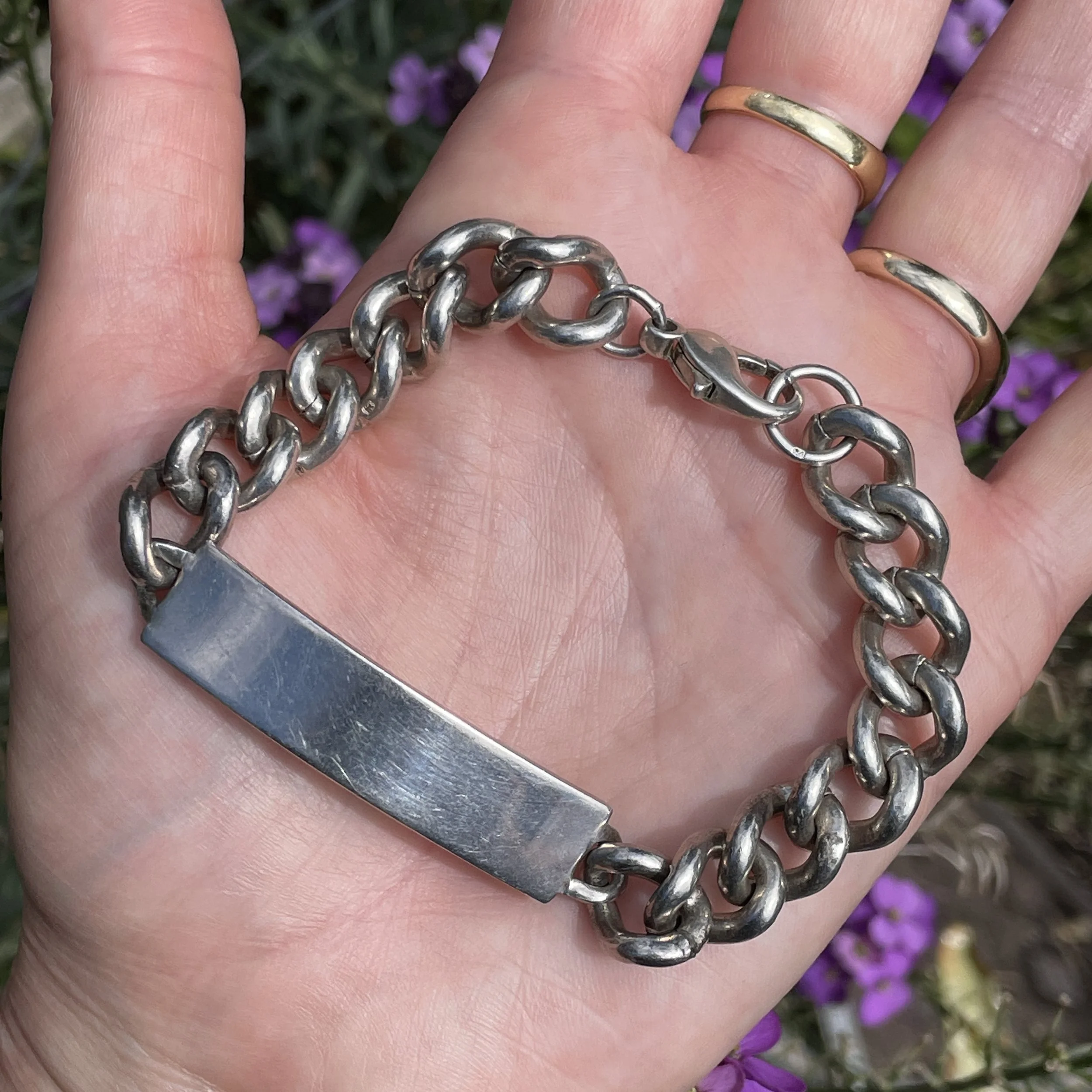 This vintage sterling silver ID bracelet features a very chunky curb link chain, with a slightly curved panel in the centre which has never been engraved. It fastens with a sturdy trigger clasp and has full London hallmarks, with the date letter for 1988 on the back of the front panel, with the lion passant stamp also on the rings by the clasp and on a couple of the chain links.
