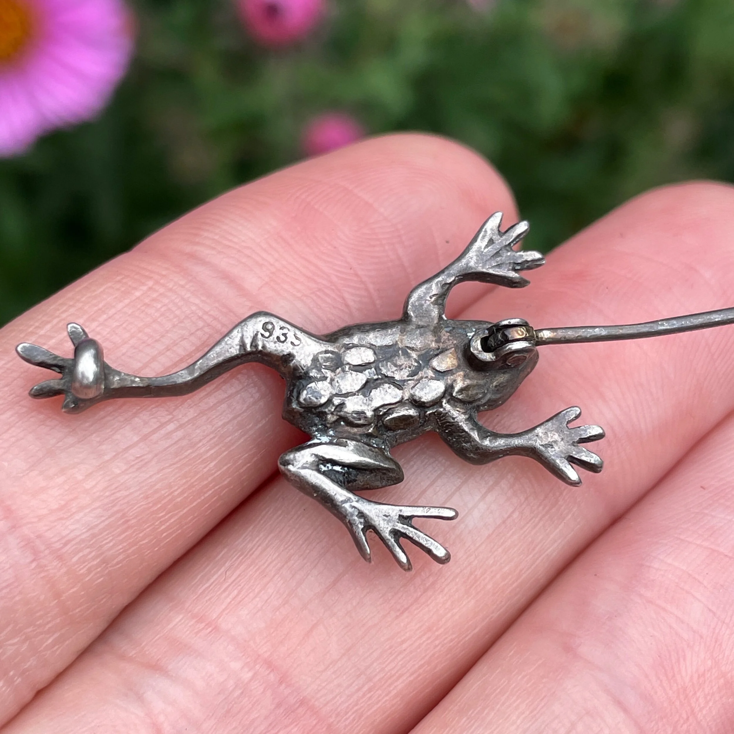 This vintage brooch is made from 935 grade silver (better than sterling!) and paste stones. It’s in the shape of a frog, and the body is encrusted with white pastes, with little pinky red eyes. It fastens with a c-clasp on the back and is stamped 935; this standard of silver was specifically used in Germany, Austria and Switzerland.
