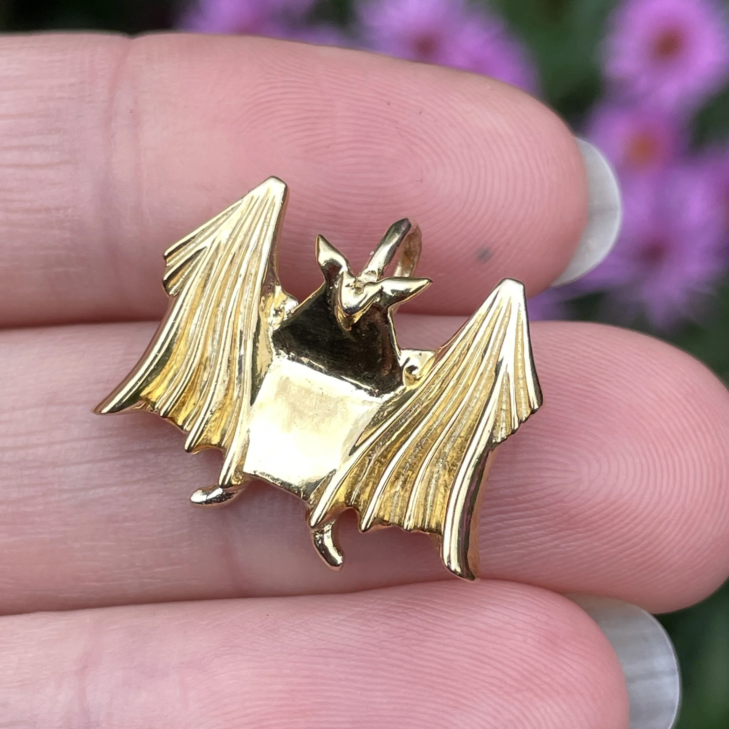 This pre-owned pendant is made from gold plated sterling silver. It’s in the form of a stylised bat and he’s stamped 925 on the back for sterling silver. There’s a large concealed bale on the back for hanging.