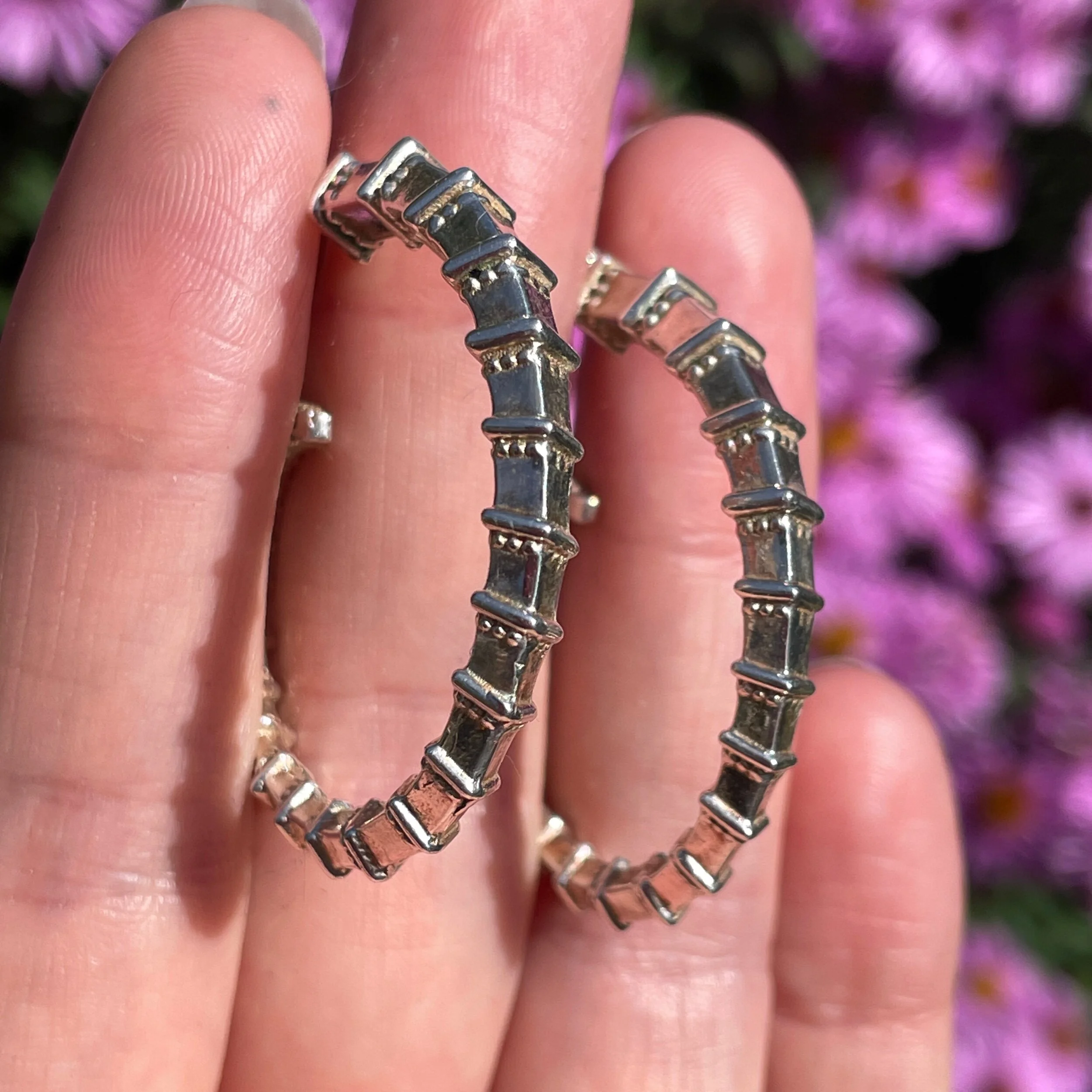 This pre-owned pair of hoop earrings are made from sterling silver and they’re designed to resemble ram’s horns. They’re stamped 925 on the posts. I can’t spot any maker’s marks but they have a good quality feel to them.