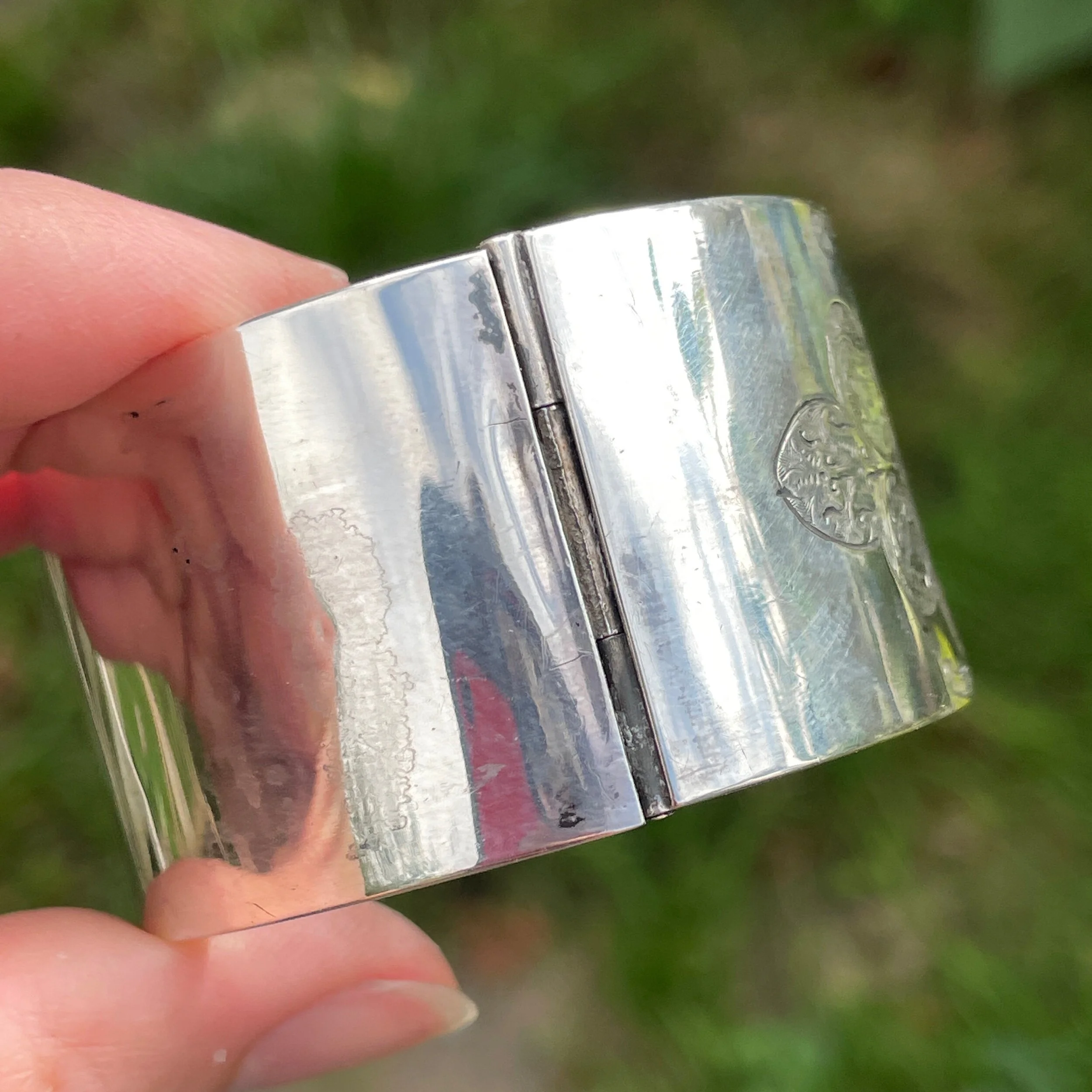 This Victorian bangle is made from sterling silver. It’s engraved with an unusual scene of a hunter hidden behind a tree, shooting a bird, with his dog running to retrieve it. The detail is excellent! The bangle is signed with the maker’s initials L.E, for Lawrence Emanuel of Birmingham. It’s unhallmarked, as was common at the time but acid tests as sterling silver throughout.