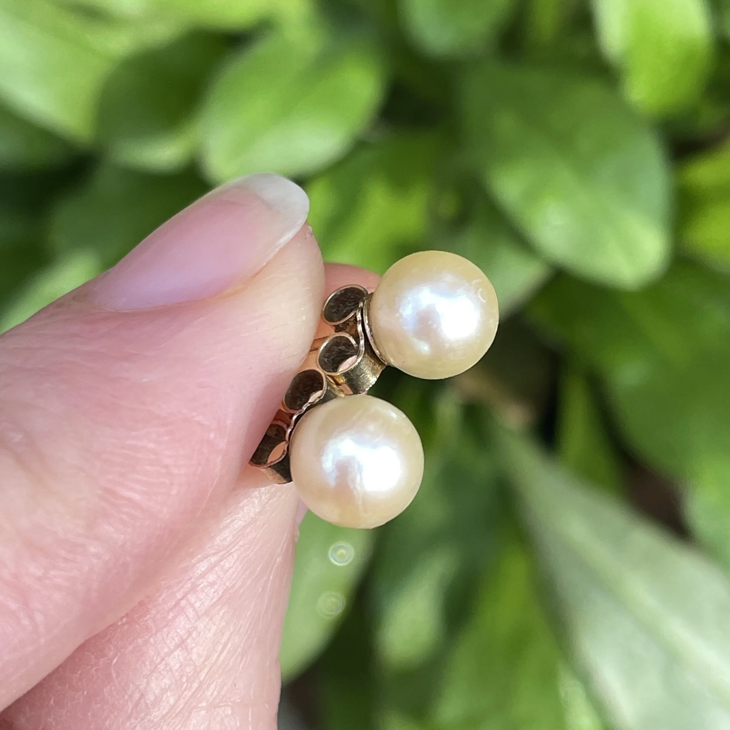 This vintage pair of stud earrings are made from 9ct yellow gold. They’re set with cultured pearls which have a slightly yellow-ish tone and are 7mm wide. They’re stamped as 9ct on both of the butterfly backs.