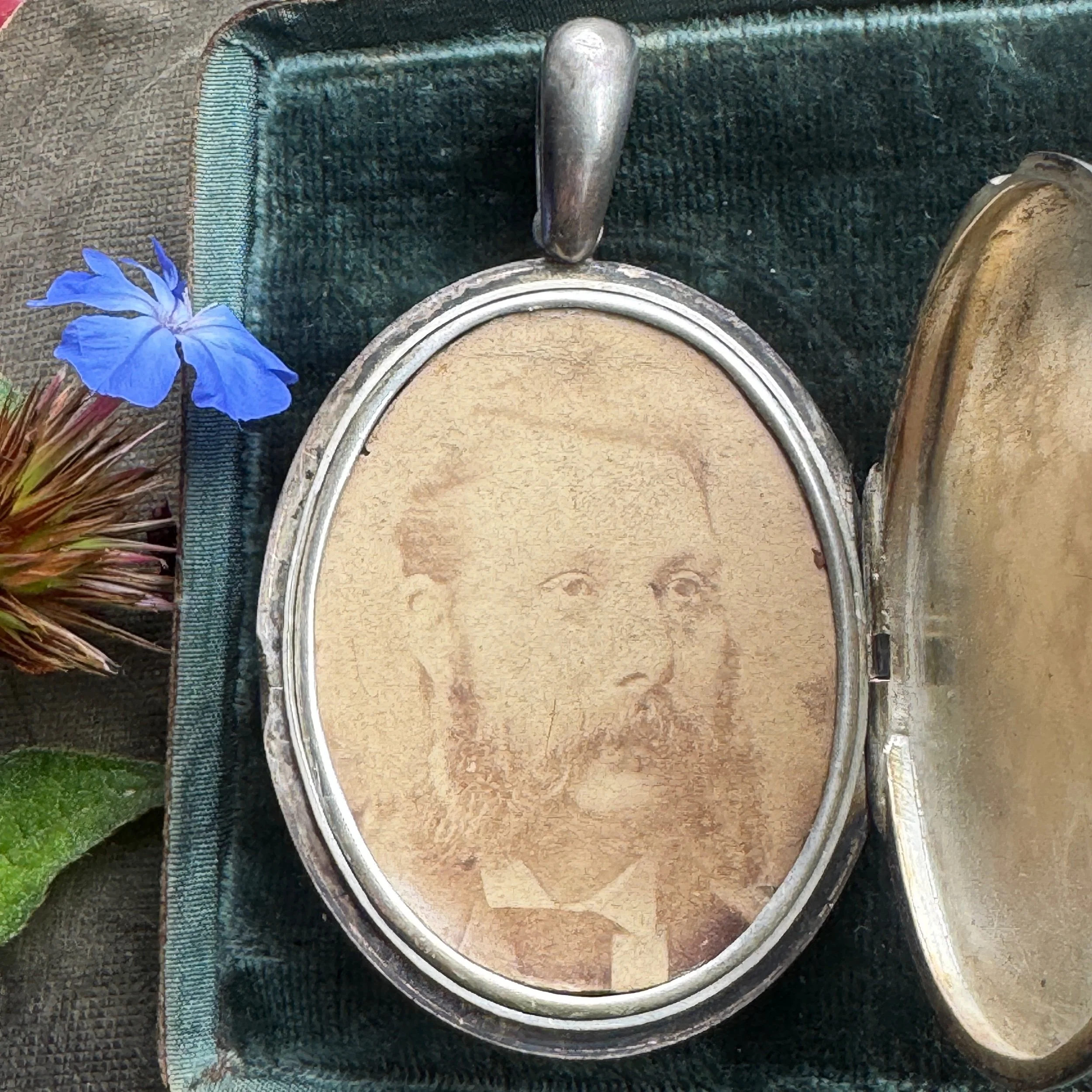 Here I have an antique silver locket, featuring a gothic monogram of the letters LM (ML) on the front. The letters are pierced from thick silver and have hand engraved detailing to emphasise the design. Inside, there’s the origin owner’s photo of a Victorian gent and this is held behind a little silver frame. The other side has lost it’s frame but if you cut a photo to the right size it should stay put. There’s a large bale at the top for hanging and as with many antique pieces, it’s not stamped but acid tests as silver throughout.