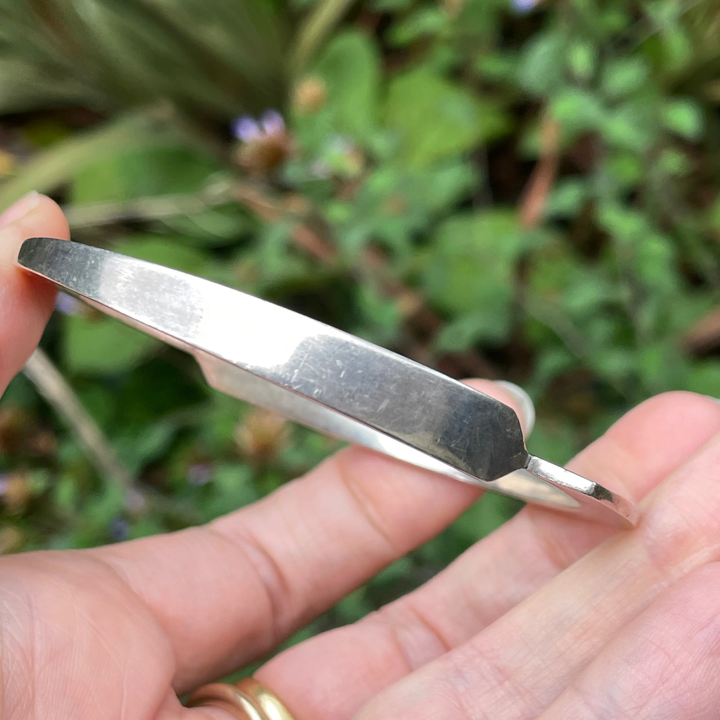 This vintage mid—century bangle is made from sterling silver and it’s by notable Scandinavian designer Jan Lundgren (1934 - 2017). It features 2 stylised tapered arrows, chasing each other around your wrist and it’s a sturdy piece weighing in at just over 30 grams! There are fabulous statement hallmarks on one side, along with his signature. The hallmarks have the P9 date letter for 1965, the letter S for sterling silver, the Swedish national mark of 3 crowns, the King Eric head meaning it was assayed in Stockholm and the JAL maker’s initials.