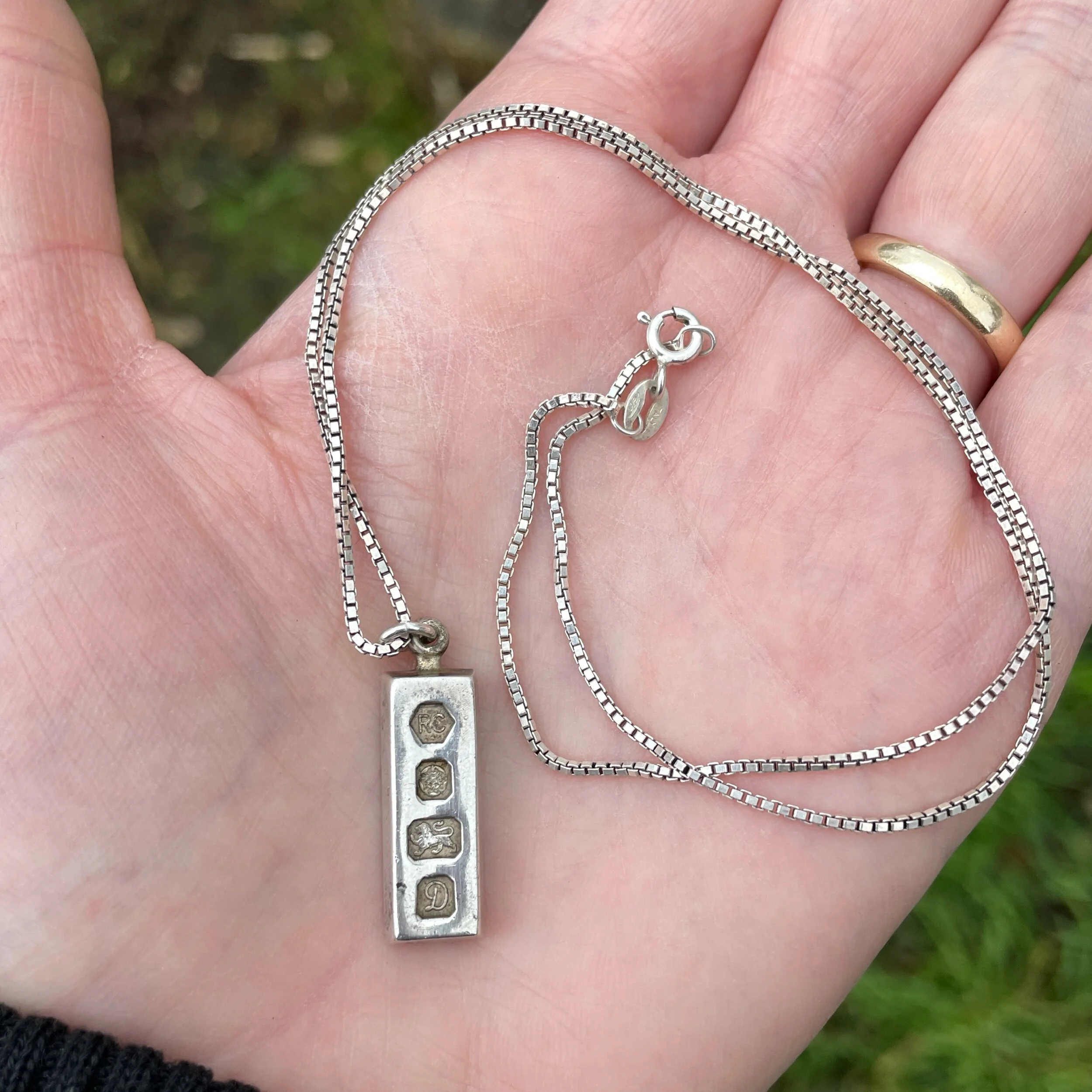 Here I have a vintage sterling silver ingot pendant from 1978. It has crisp statement hallmarks on the front, from the Sheffield Assay Office. It hangs on an 18” sterling silver box link chain which is a bit more recent than the ingot.