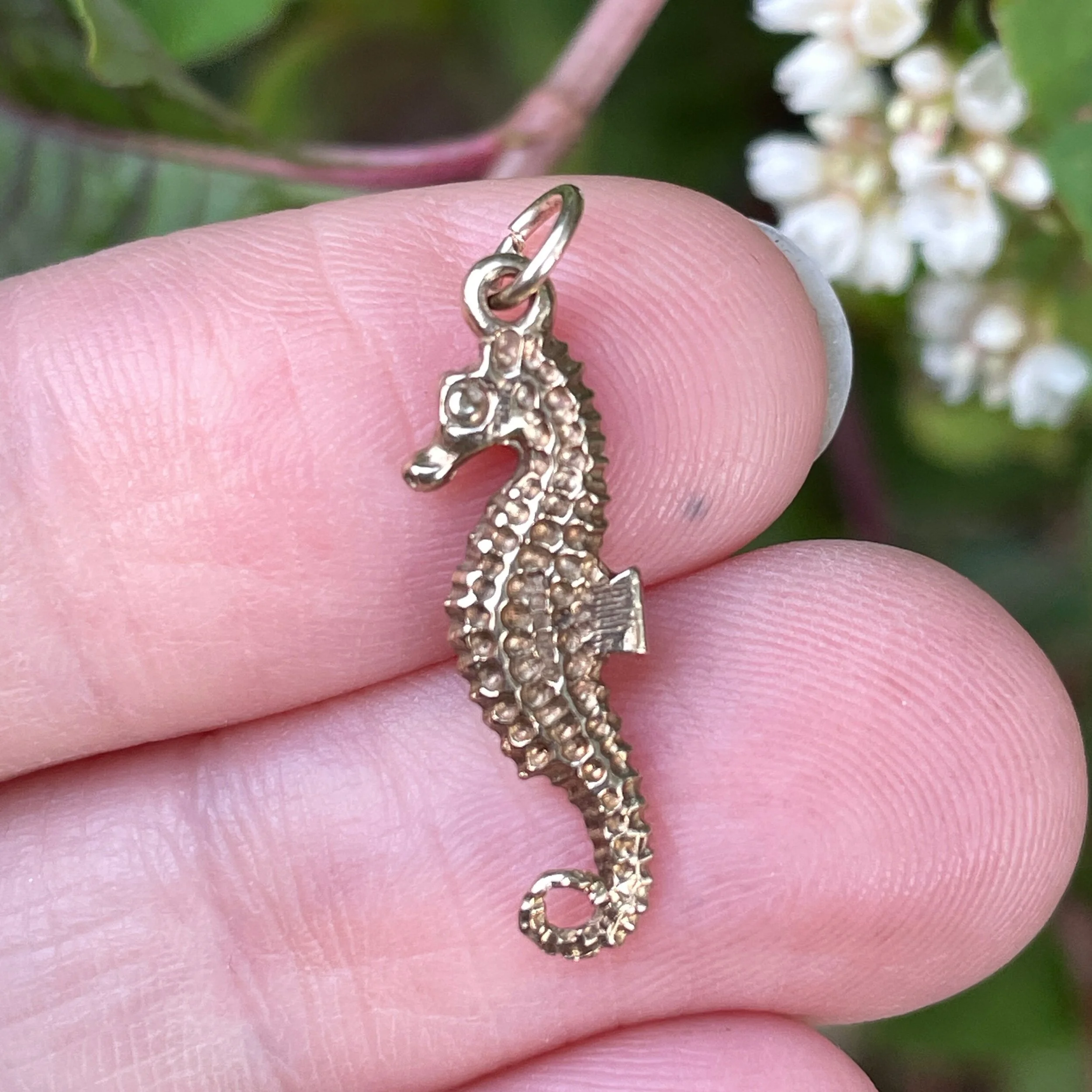 This pendant is made from 9ct yellow gold. It depicts a seahorse with lovely detail front and back. There are hallmarks on one side, with the date letter for 1990.