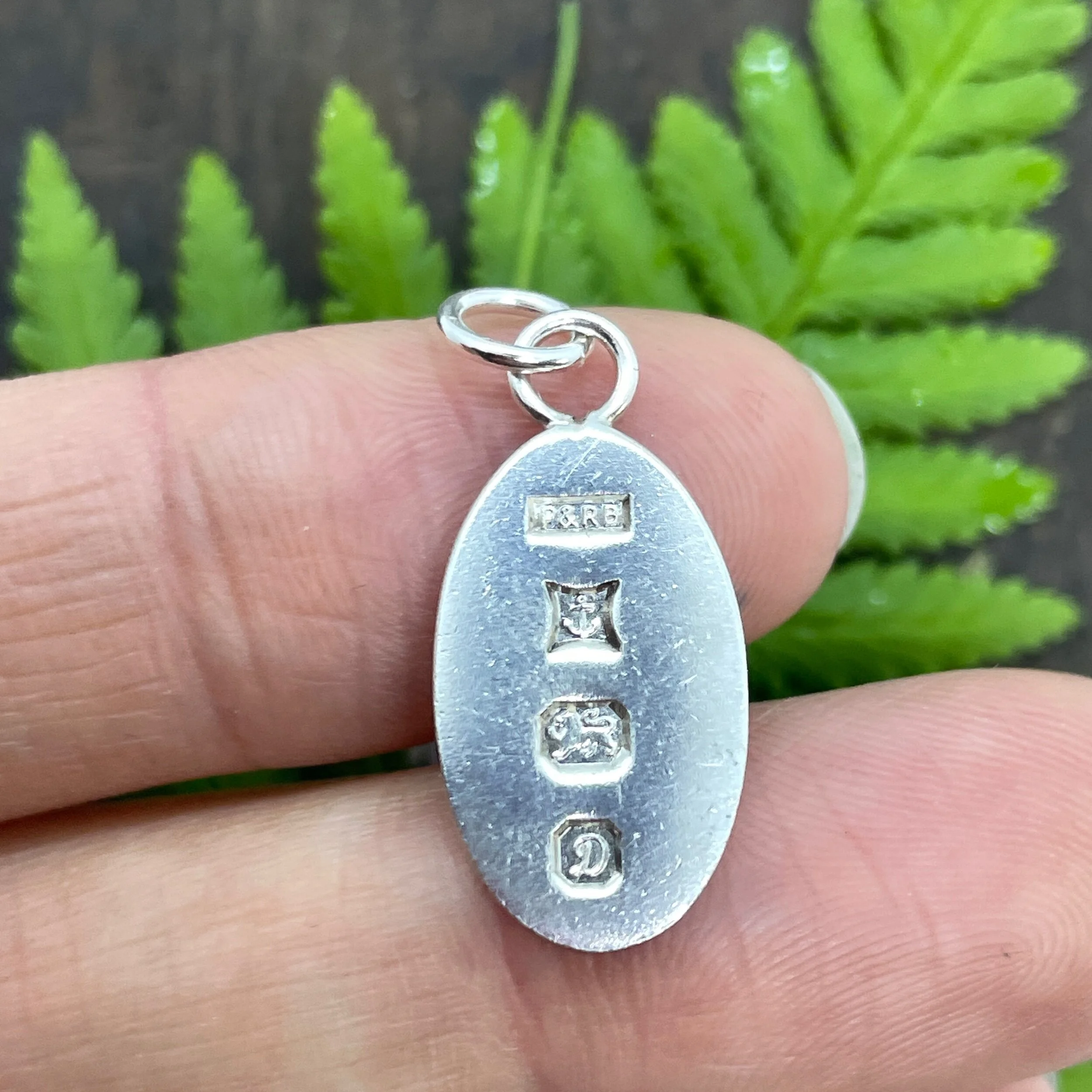 Here I have a vintage sterling silver ingot pendant from 1978 in an unusual oval shape. It has crisp statement hallmarks on the front, from the Birmingham Assay Office. There’s a bale loop at the top for hanging.