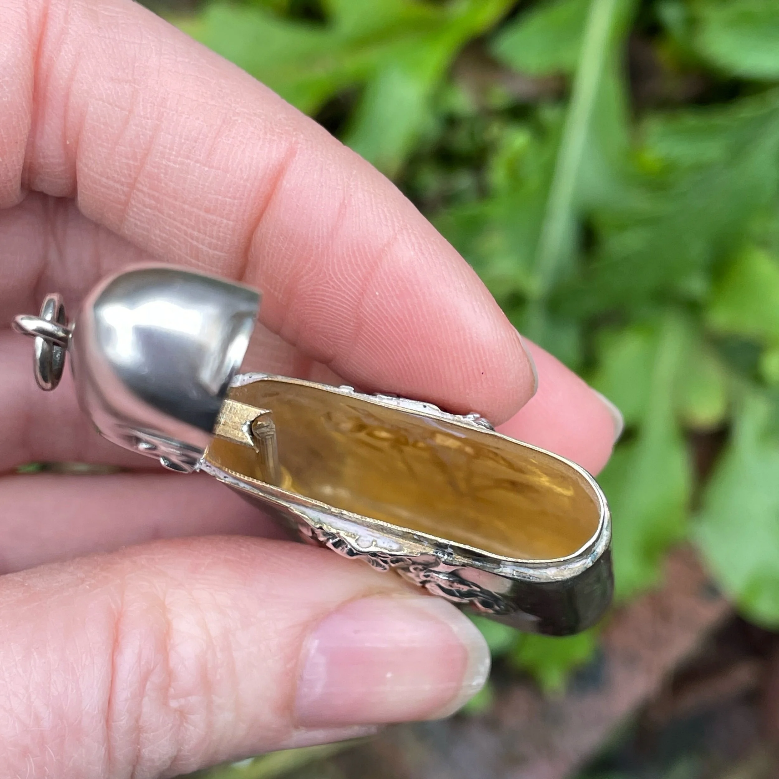 This antique vesta case is made from 800 grade silver and is likely to be French in origin. It was originally designed to be hung from a gentleman’s pocket watch chain, to hold matches to keep them safe and dry (the ridged bit on the base was for striking them), but today you can pop any little keepsake inside. It’s beautifully embossed on both sides with an iris flower design, which during the late Victorian era, when this was made, symbolised faith, courage and admiration. The inside of the vesta is gilded and it’s stamped as 800 silver on the rim on the base. It dates from circa 1890.