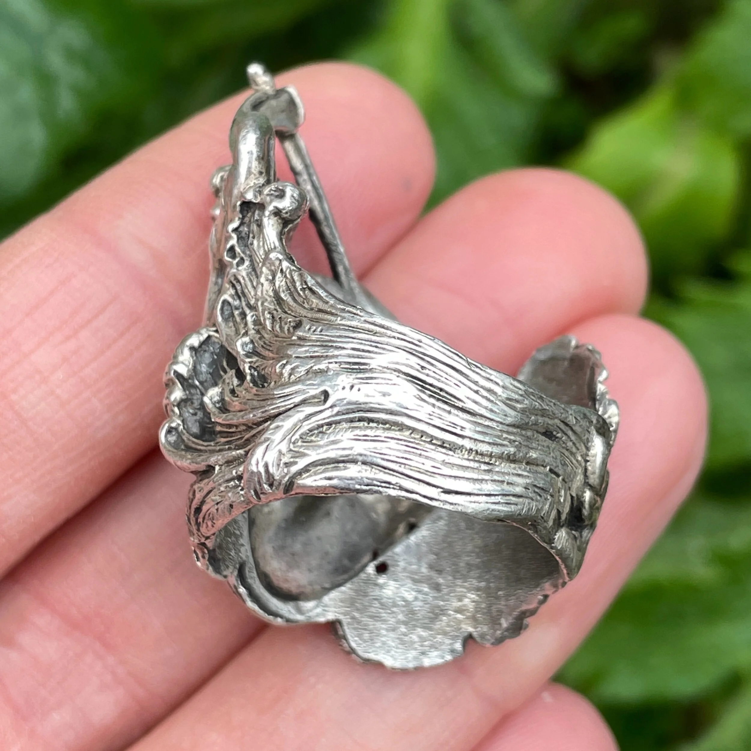 This vintage ring is made from sterling silver. It depicts the God of the Sea, Poseidon / Neptune, with amazing detail going al the way around. The ring has a full London hallmark within the band, with the date letter for 1972, with the sponsor’s initials DE. This design is credited to Paterson Riley, founder of the Great Frog in London, and 1972 happened to be the year the store was created so I presume DE was either the mark of a silversmith who Riley used before he got his own sponsor’s mark, or those were his original initials before he adopted a more rock’n’roll name?!