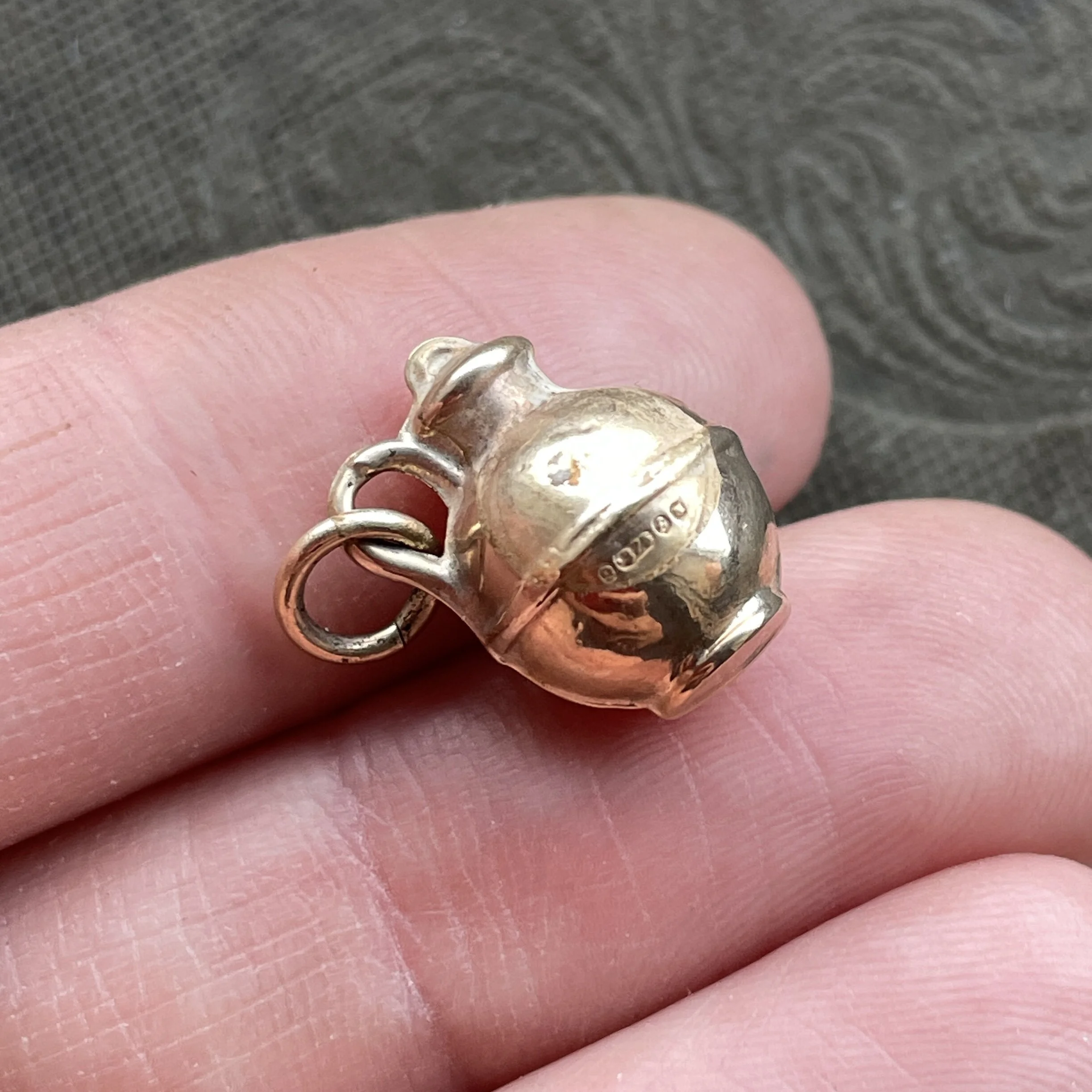 This vintage pendant is made from 9ct yellow gold. It’s in the shape of a Jersey creamer jug and it’s puffy/hollow so is quite lightweight. It’s hallmarked for 9ct on one side, from the London Assay Office, with the date letter for 1961.