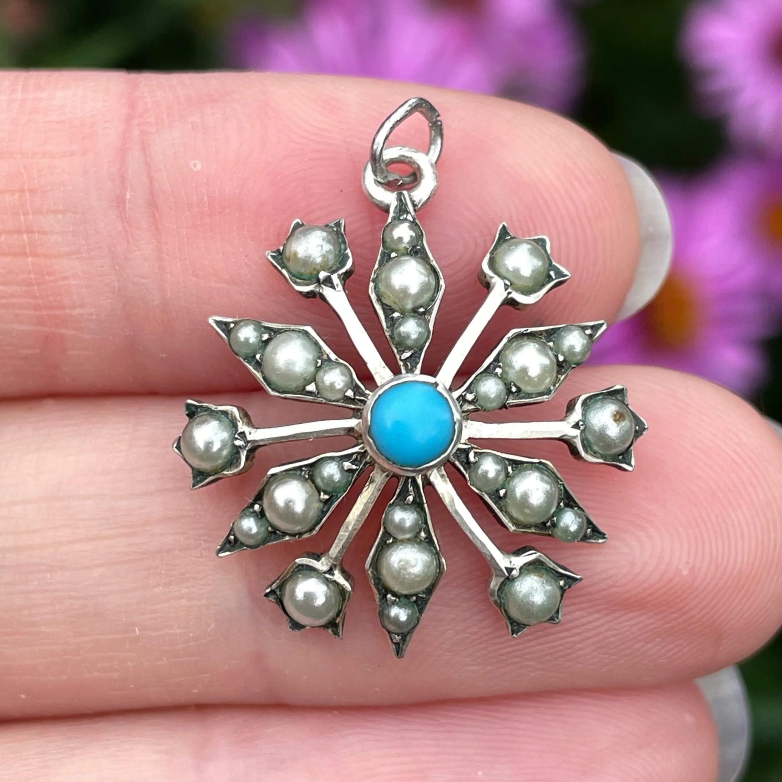 Here I have an antique pendant, which is made from silver and is in the shape of a snowflake. It’s set with natural seed pearls and a turquoise stone in the centre. There’s a small bale at the top for hanging and it’s stamped Silver on the back. It dates from circa 1900.