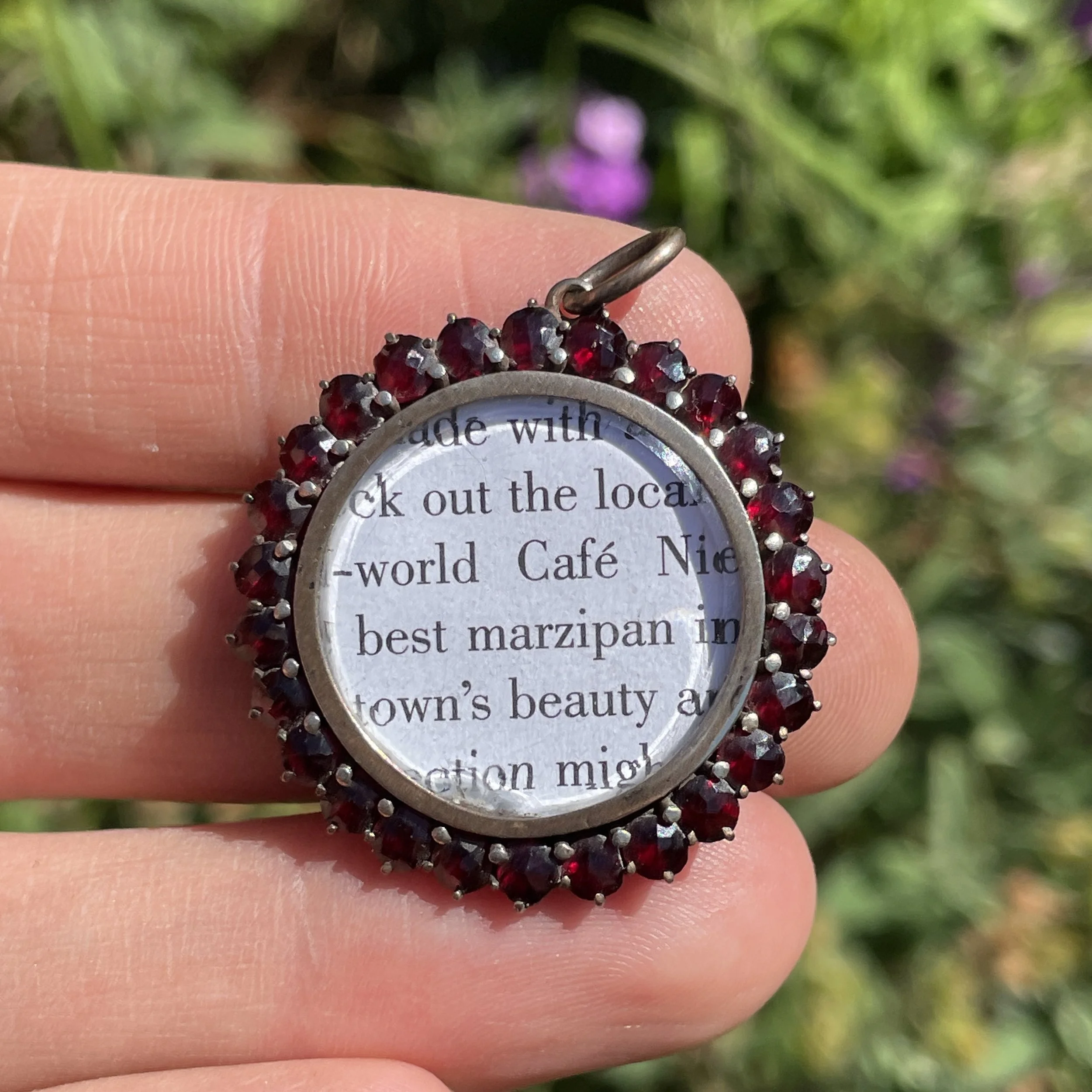 Here I have a Victorian Bohemian garnet pendant. It has a halo of rose cut garnets around the front and bevelled glass panels on the front and back. The rear panel can be prised out so you can put a picture inside. It’s made of “garnet gold”, which is gilded base metal. tTe Bohemian jewellers of that time used a range of metals to set their garnets so everyone could afford it, from expensive gold to cheaper gilded base metal like this (and more recently gilded silver). It has a rosey-coppery tone.