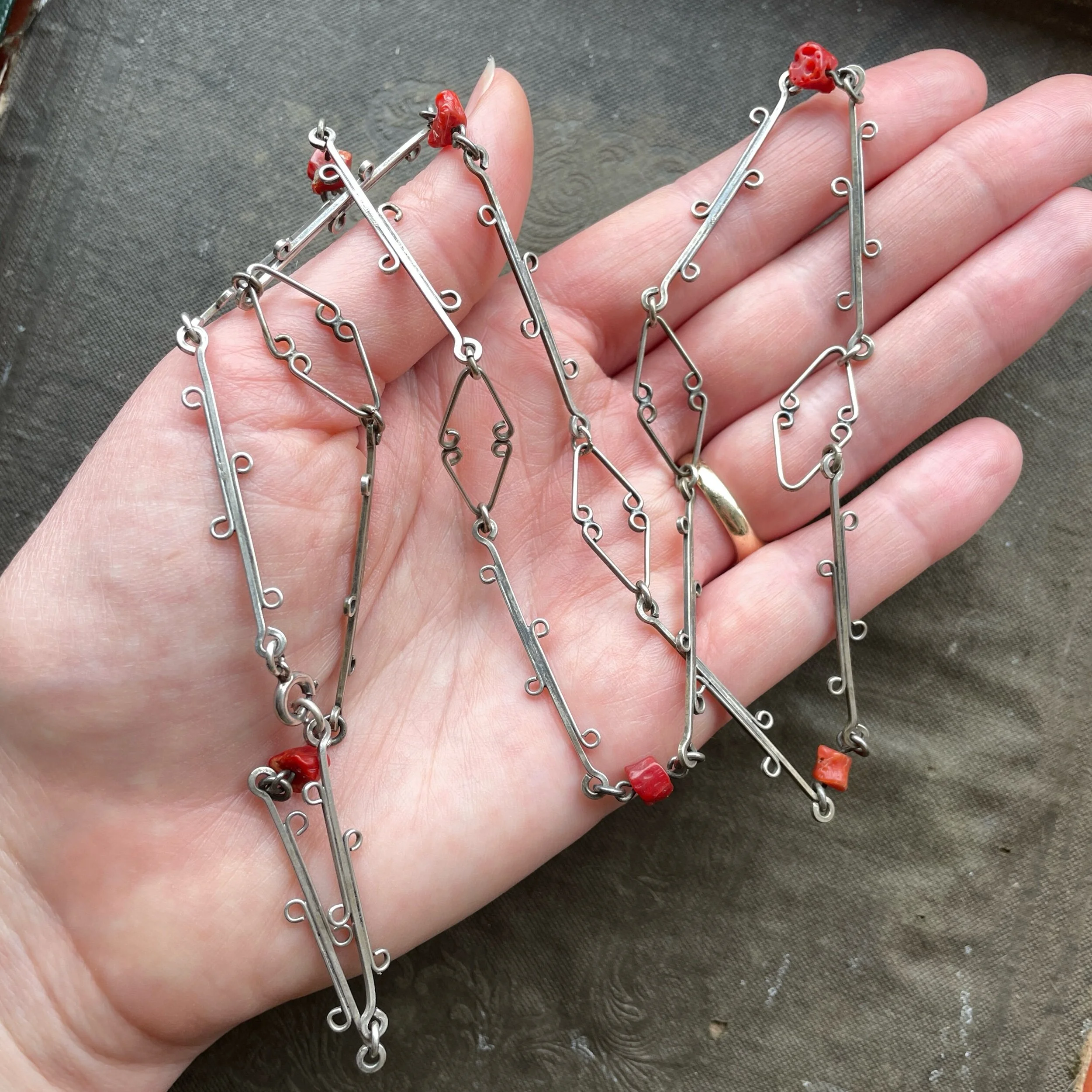 Here I have a vintage 800 silver handmade chain. It features long links interspaced with coral beds and diamond shaped links. The bolt ring clasp is stamped as sterling, however I believe the chain itself is 800 grade.