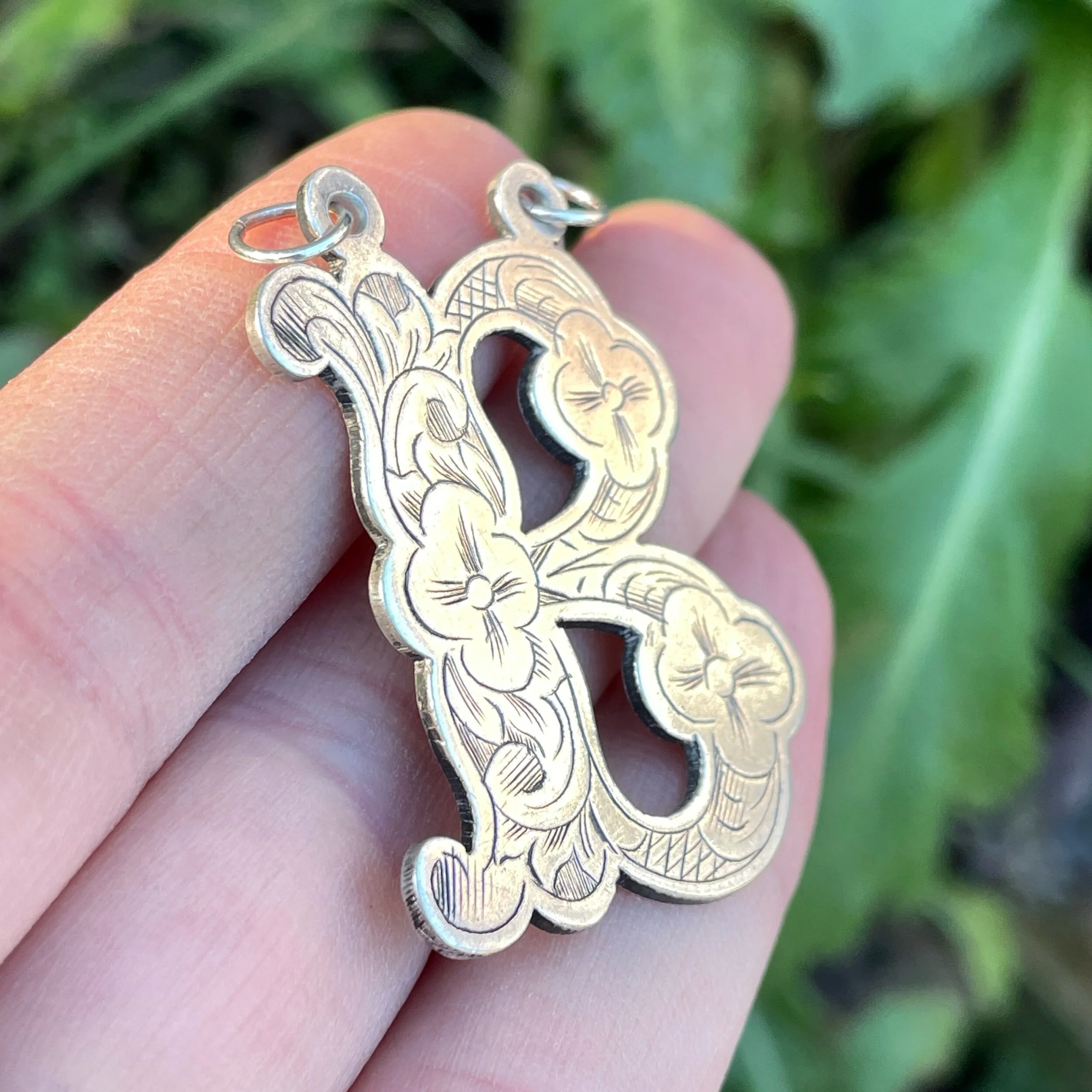 Here I have a Victorian silver letter B pendant. It has hand engraved flower and leaf decoration on the front and two split rings at the top for hanging on a chain. This would have originally have been a decanter label for Brandy, but today it makes a perfect pendant! As with many antique pieces, it’s unmarked but I’ve acid tested it to confirm it is silver.
