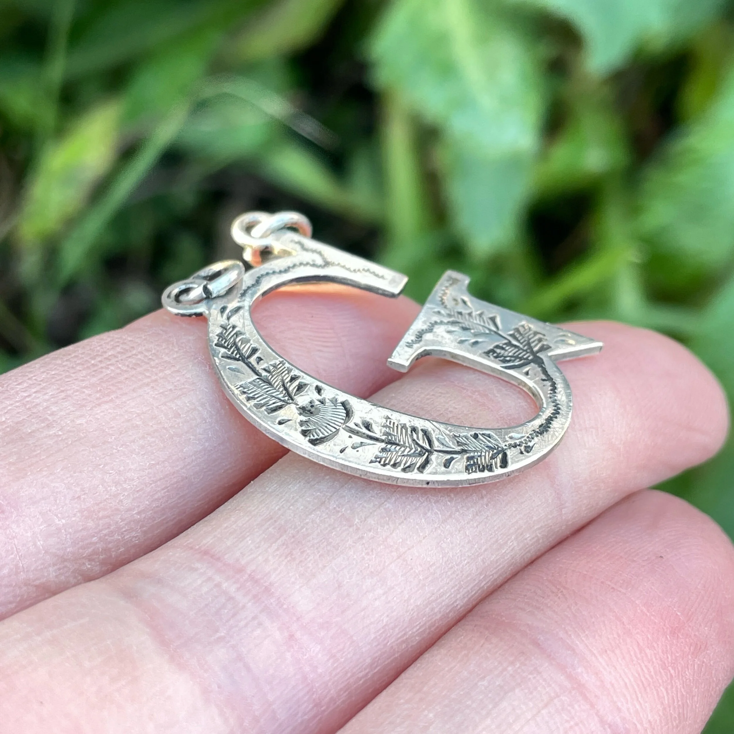 Here I have a Georgian/early Victorian silver letter G pendant. It has hand engraved leaf decoration on the front and two split rings at the top for hanging on a chain. This would have originally have been a decanter label for Gin, but today it makes a perfect pendant! As with many antique pieces, it’s unmarked but I’ve acid tested it to confirm it is silver.