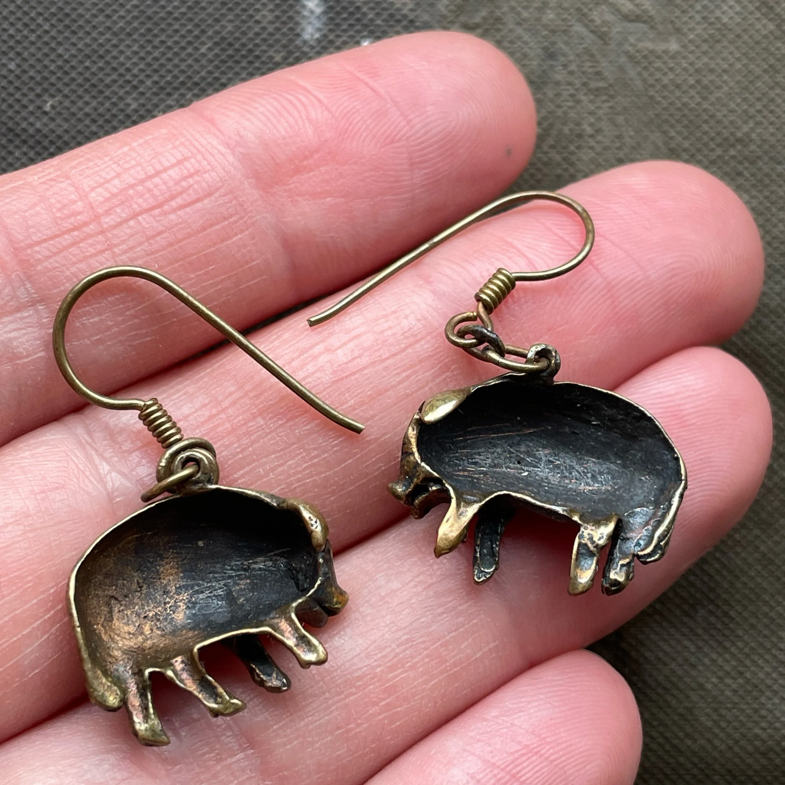 This vintage pair of earrings are made from base metal. They feature a pair of sweet little piggies, with hook fastenings