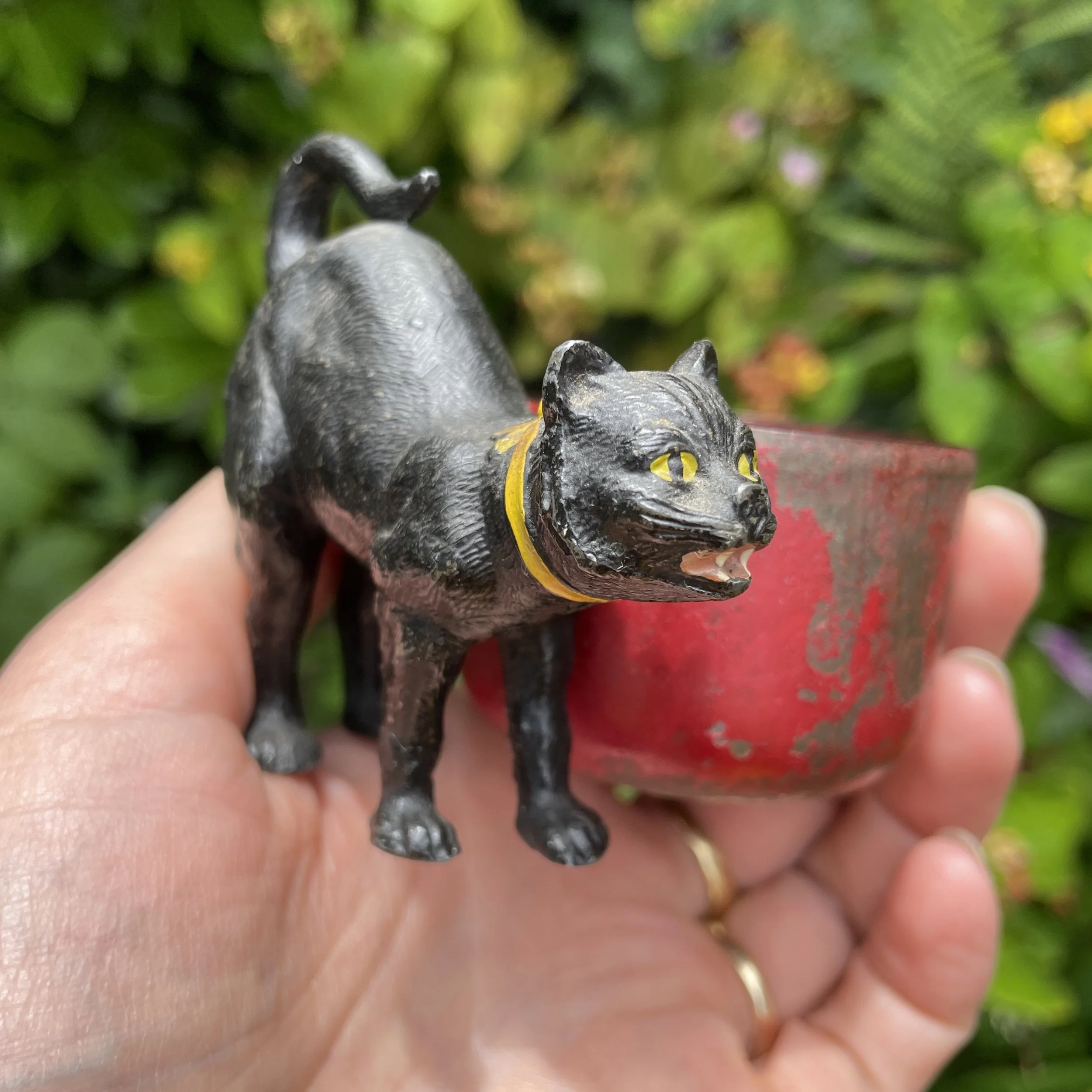 This antique kitty was probably intended to protect your matches originally, but today you could pop anything you want inside! It features a little round pot and to the side is a black cat, with back arched and teeth on show, wearing a yellow bow around its neck. The whole thing is made from painted metal and there’s some rubbing, mostly to the pot rather than the cat, from past use. Photos were taken indoors and outside in direct sunlight.