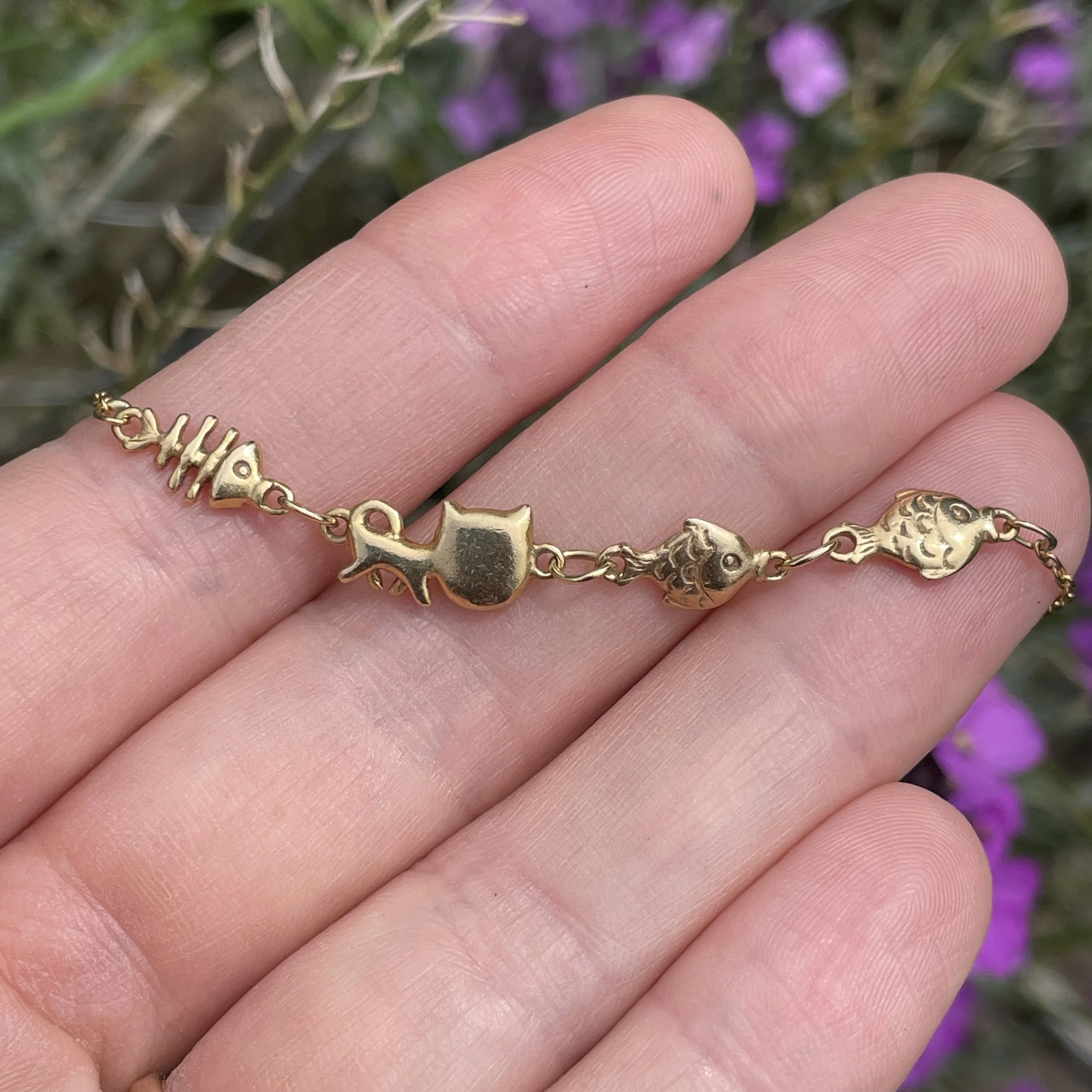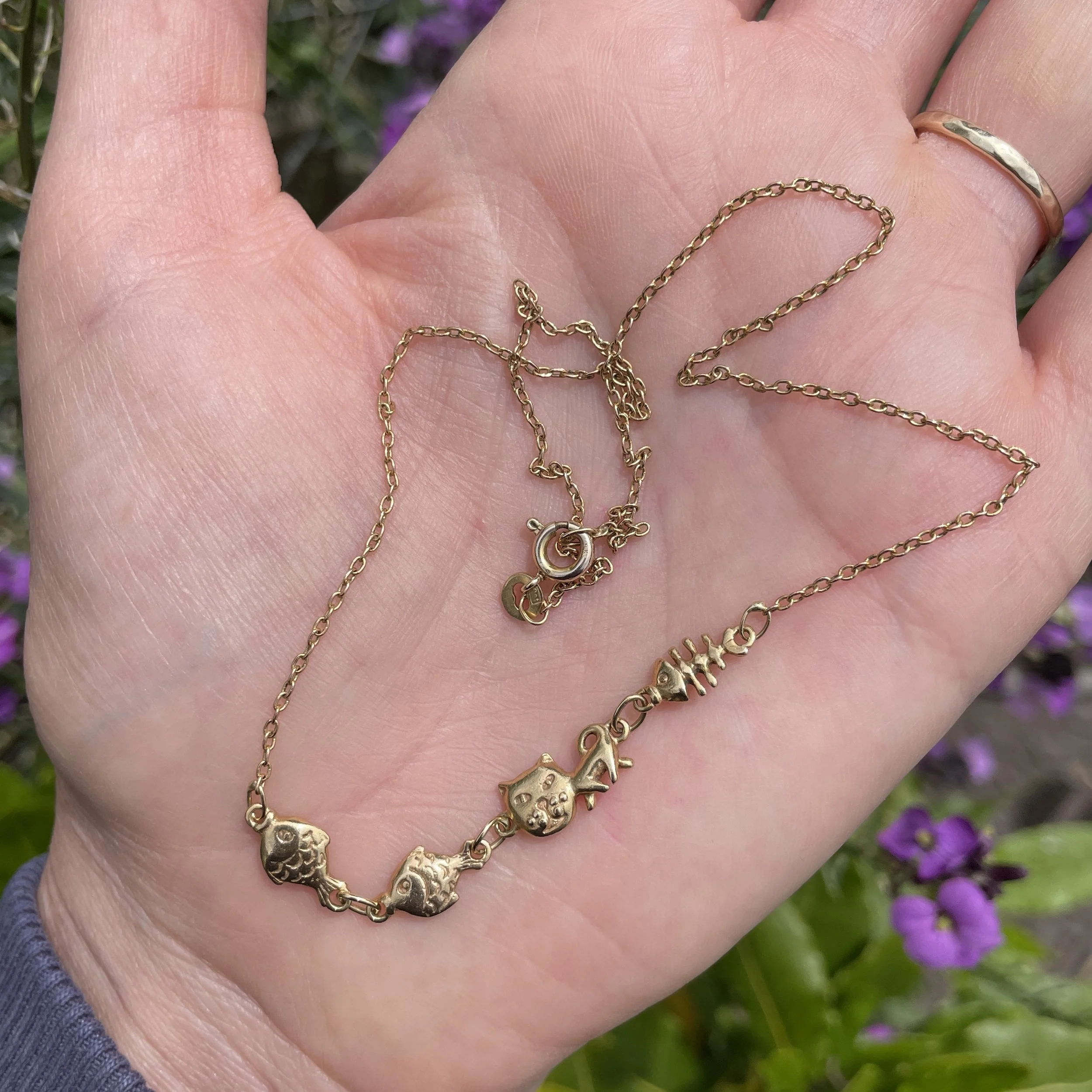 This hilarious vintage 9ct gold necklace features a little cat, chasing 2 fish, and leaving some fish bones in its wake! It fastens with a bolt ring clasp and there’s a full UK import hallmark by the clasp, with the date letter for 1978.