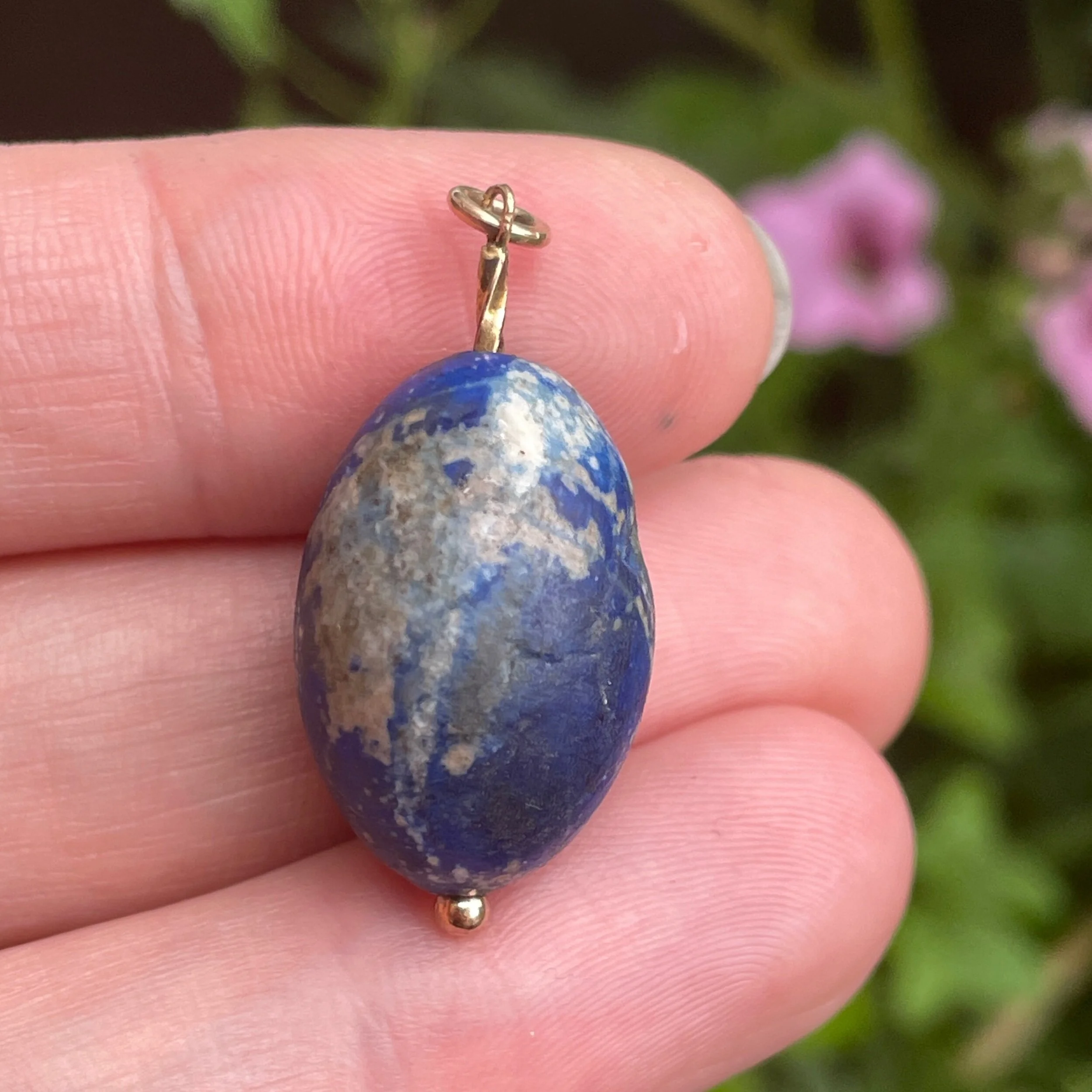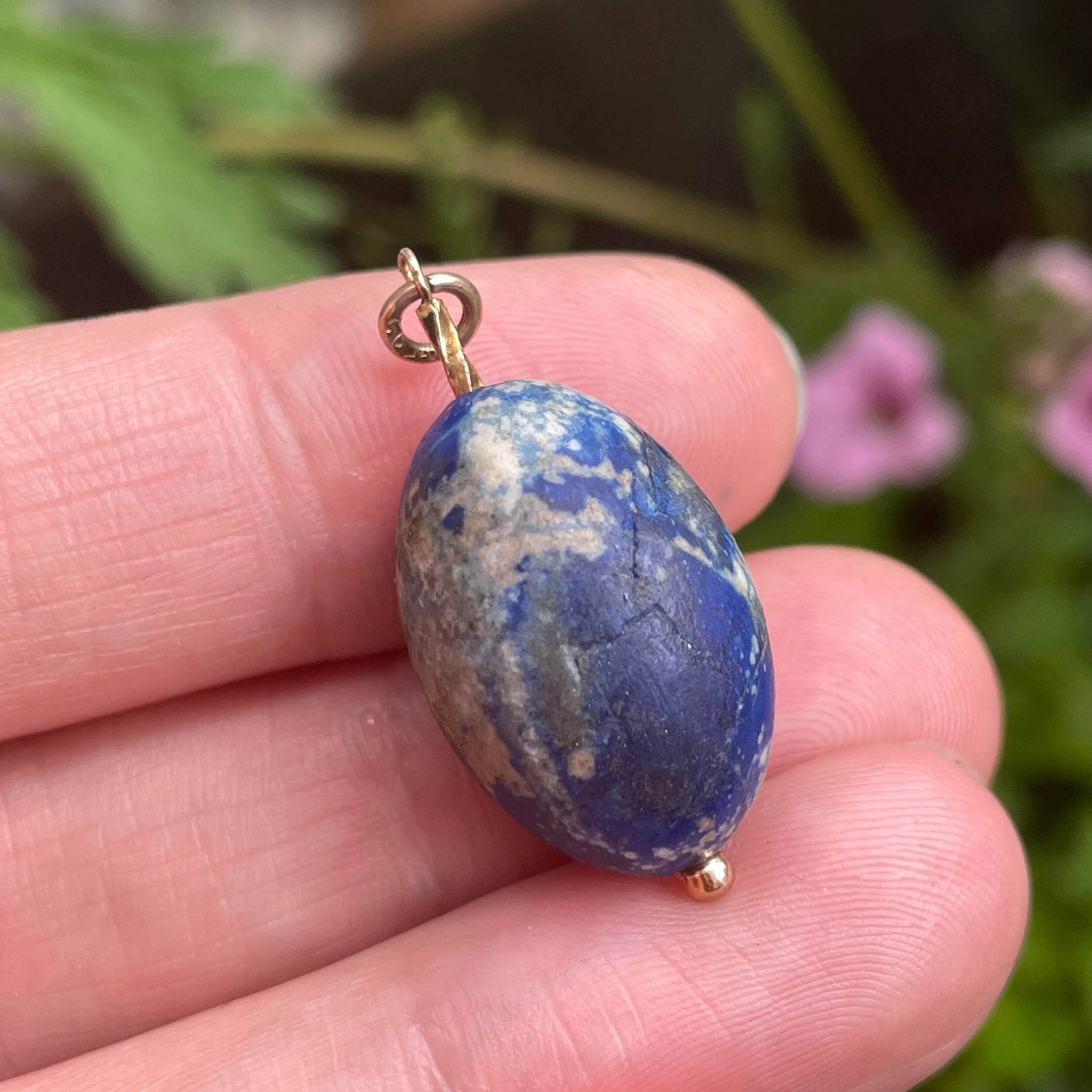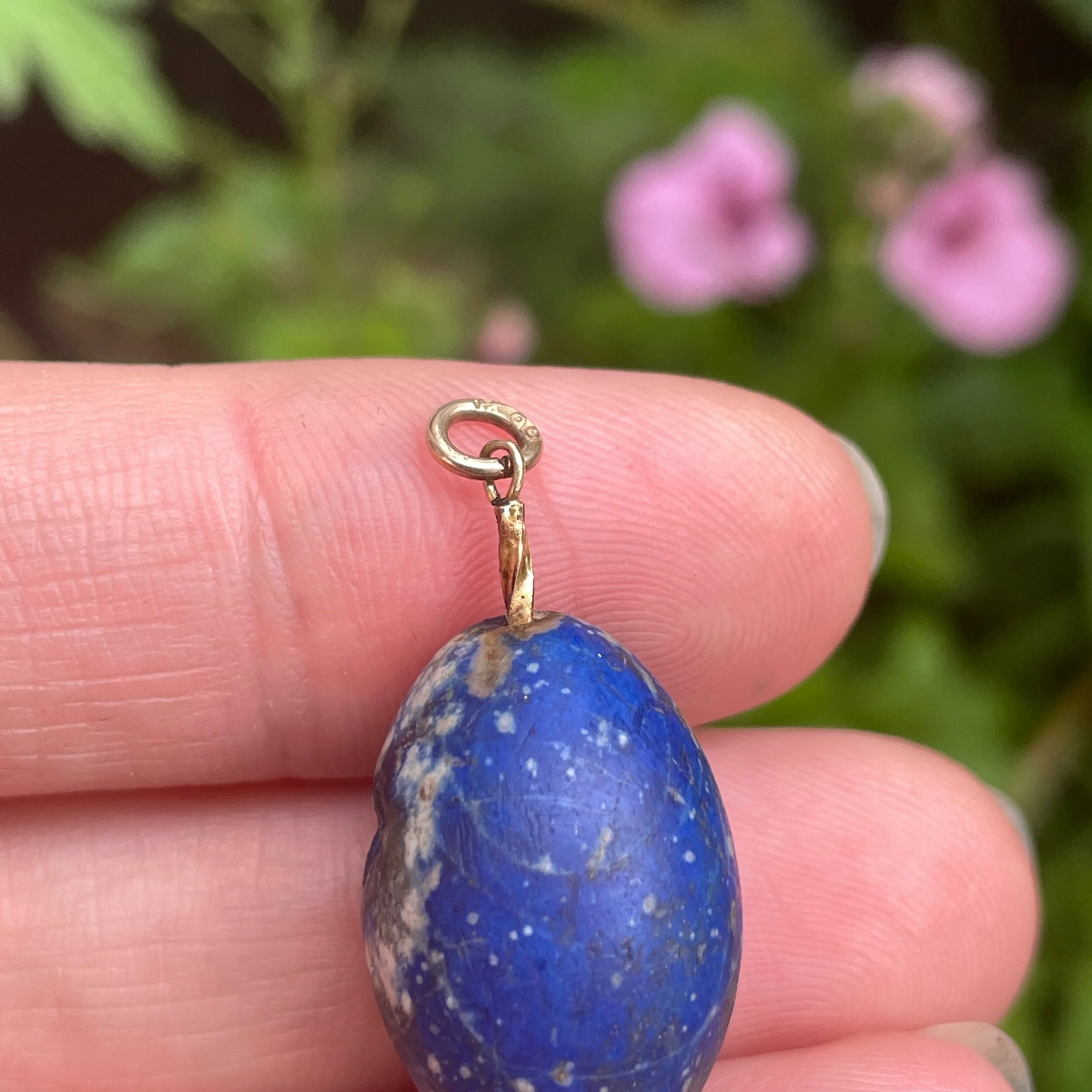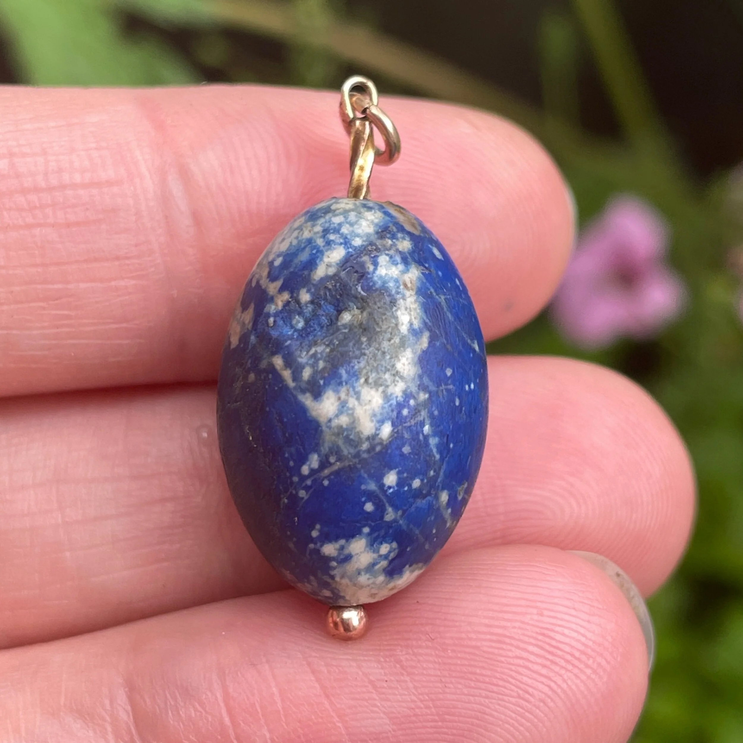 This antique charm or pendant is made from a lapis gemstone bead, with gold fittings. The split ring at the top has some stamps but they’re tricky to make out, however it acid tests as gold. The lapis has some very, VERY tiny pyrite inclusions which are near impossible to photograph but you can see one in the last photo, about 1/4 way down the stone sitting in the middle of a pale grey spot.