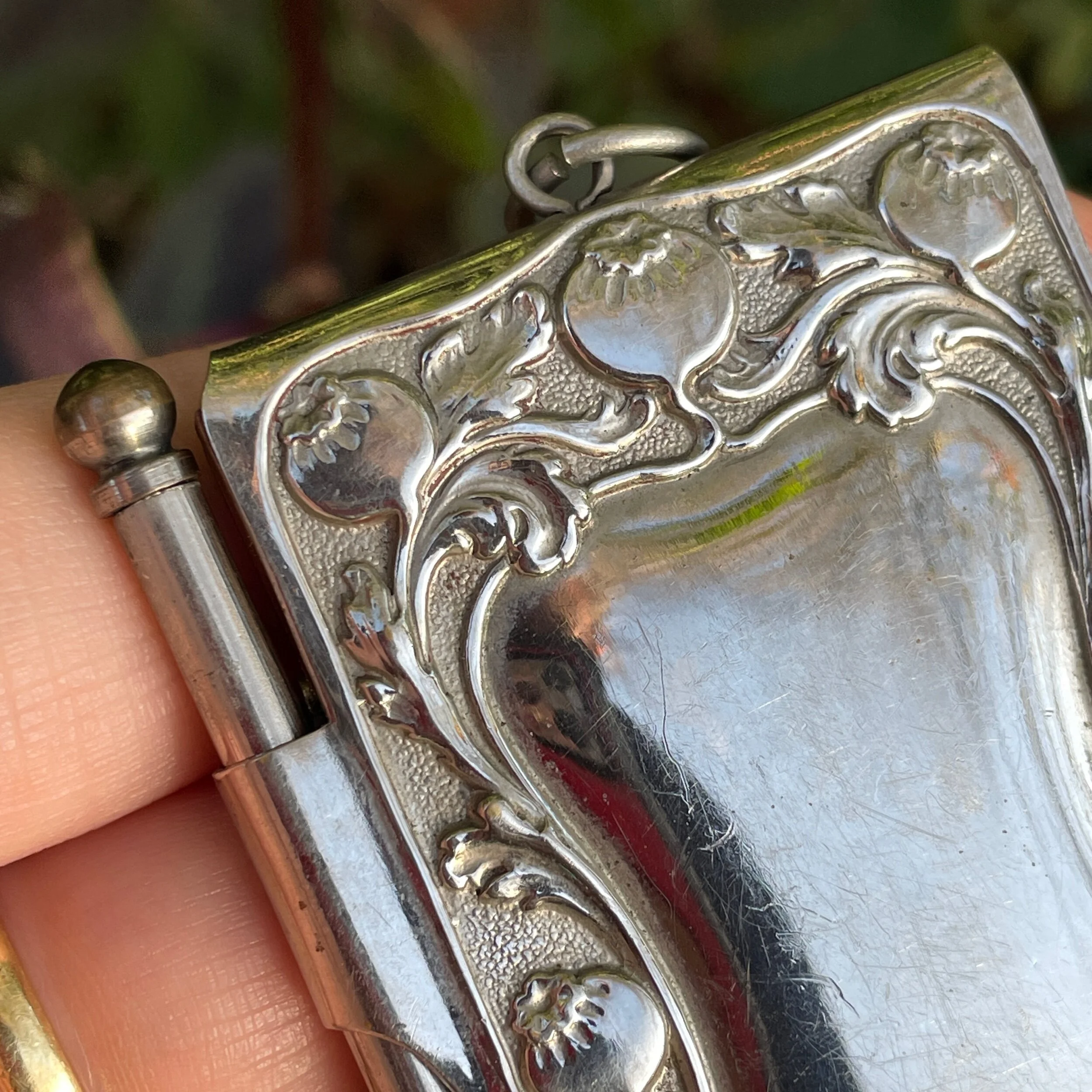 This antique aide memoire/notebook is made from silver plated brass. It depicts an owl with wings outstretched, on a pine tree branch (look at those pine cones!), and owl has its original little amber glass eyes. Above is a swirling poppy head and leaf design which is also repeated on the reverse around an empty cartouche where initials could be engraved. The lid works on a spring, so when you remove the little pencil to the side, it pops open. The pencil is original and it still contains some lead! You extend and retract the lead by twisting the little sphere at the top. Inside, the original gold-edged notepad is also still present with just a few of the top pages missing. The front page has “Dear Glad, love George” written upon it, the rest of the pages are blank.