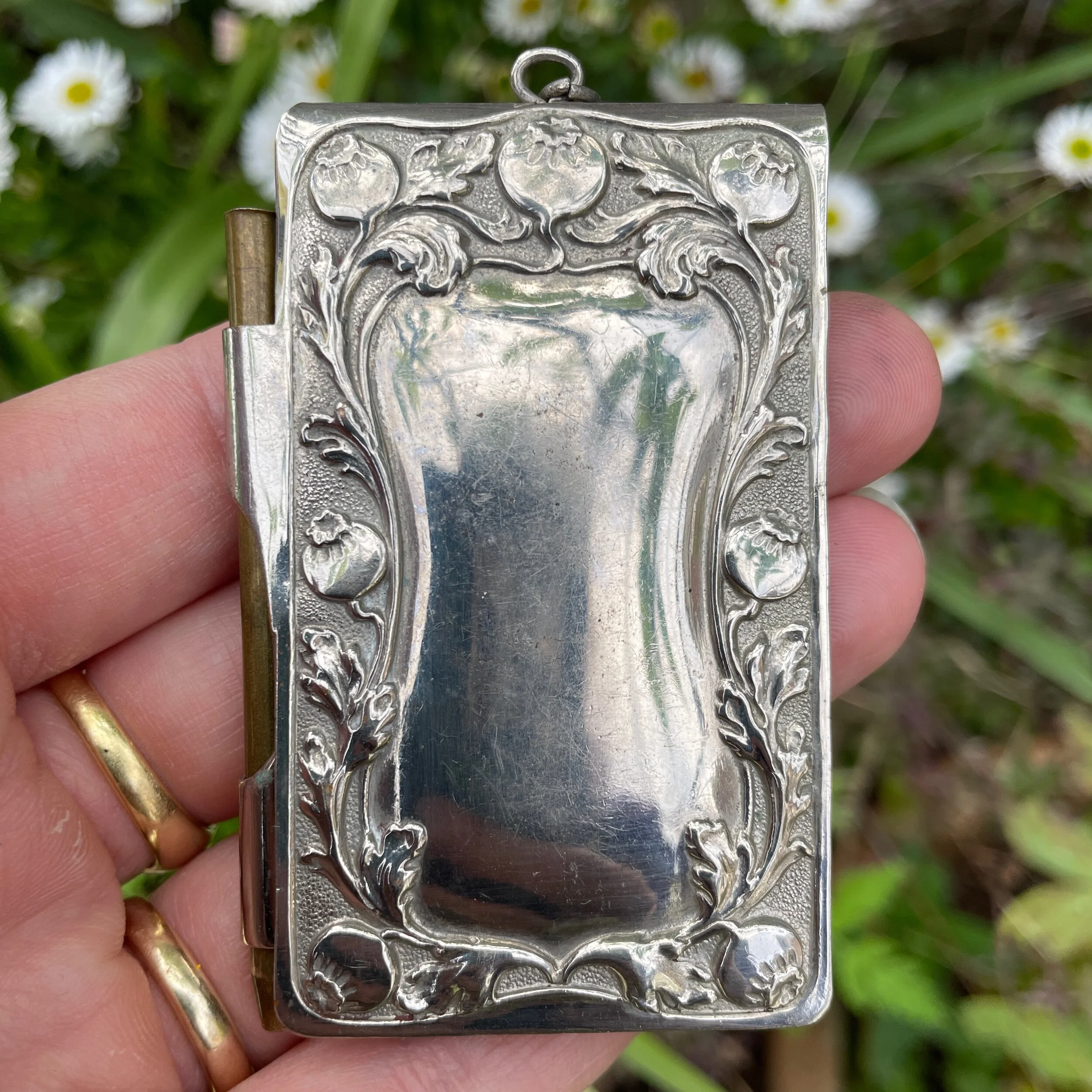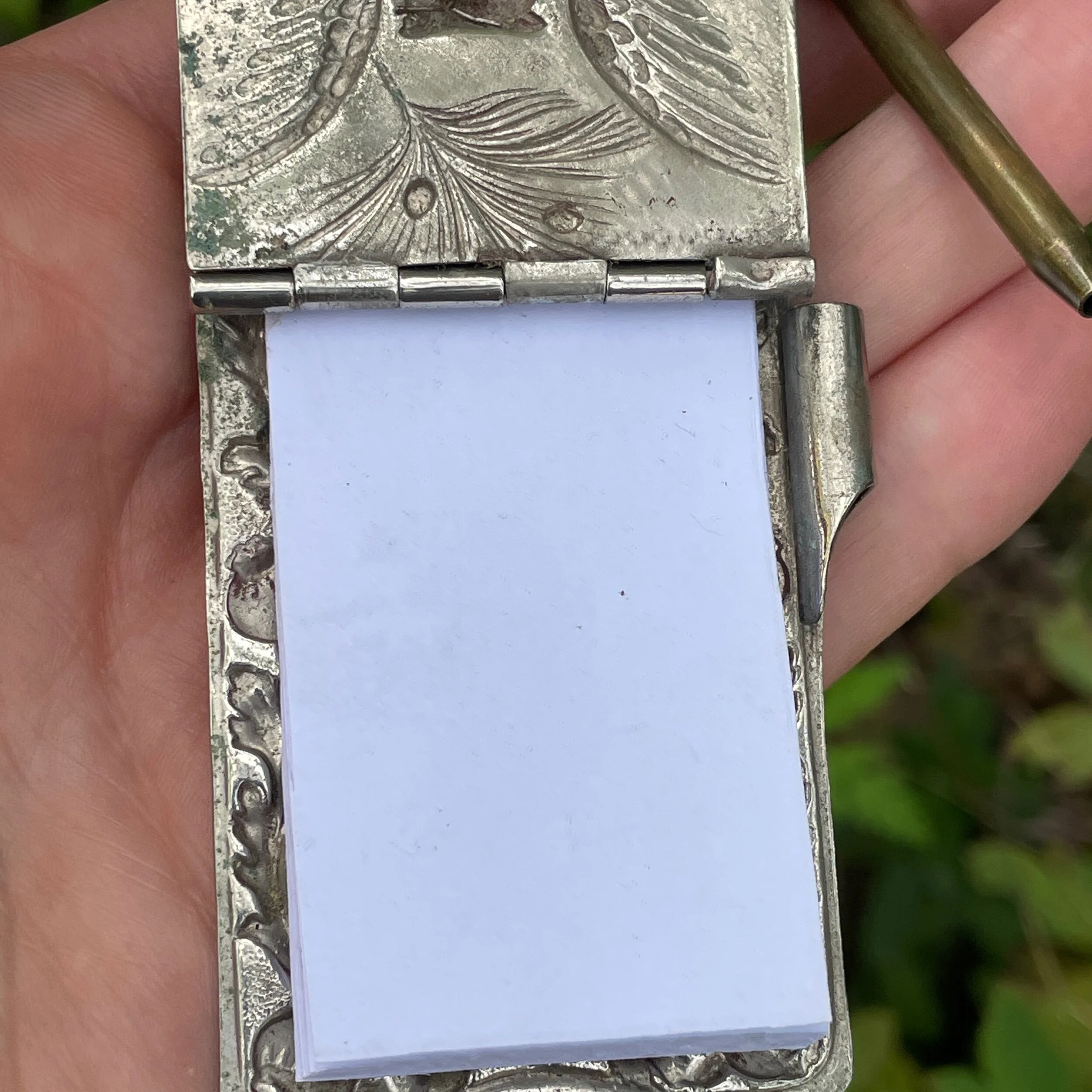 This antique aide memoire is made from silver plated brass. It depicts an owl with wings outstretched, on a pine tree branch (look at those pine cones!), the owl has its original little glass eyes. Above is a swirling poppy head and leaf design which is also repeated on the reverse around an empty cartouche where initials could be engraved. The lid works on a spring so when you remove the little brass pencil to the side it pops open. I’ve made a little notebook for inside out of scrap paper, you could fashion something much nicer out of better paper, cut to size and stapled! The pencil is currently not useable as it’s lost the piece inside which holds the lead and the top bit which pushes it down, so at present this just functions to hold the notebook together when closed.