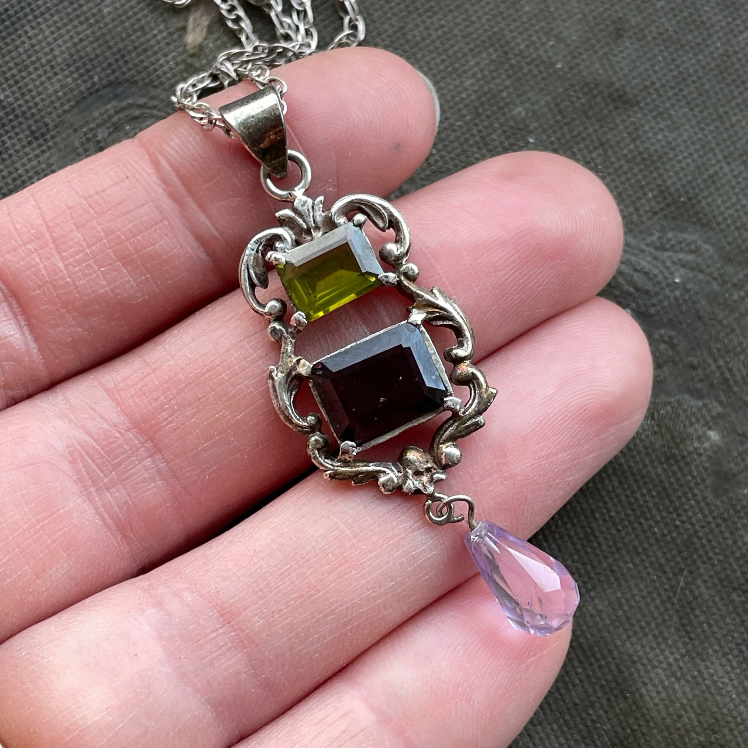 This vintage necklace is made from sterling silver. the pendant is set with garnet, peridot within a scrolled frame, and there’s an amethyst drop hanging at the bottom. The necklace length is 24” and it’s marked for sterling silver on the clasp.