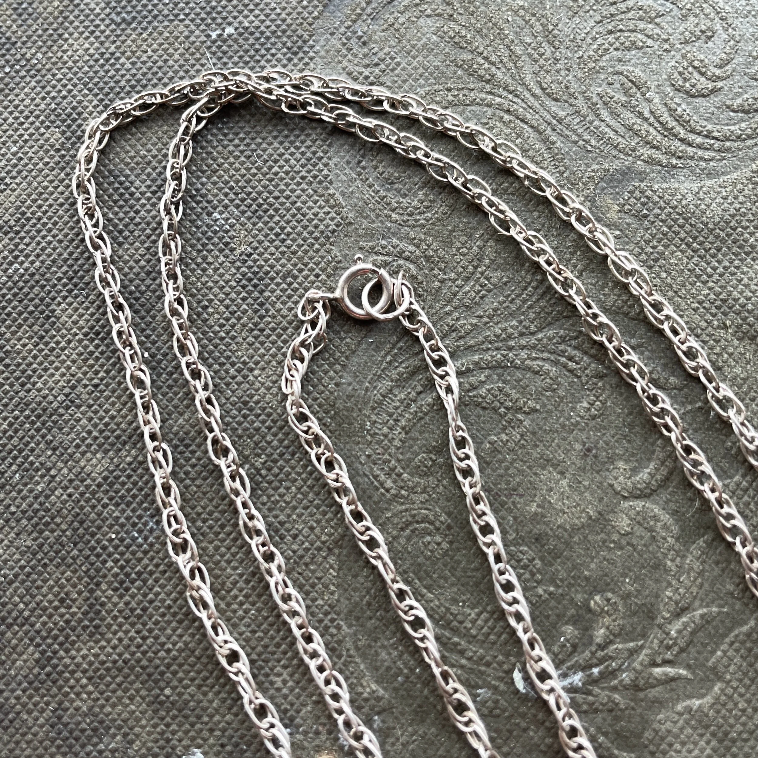The necklace is 24” long. The pendant is 5.6cm long with the bale and 1.8cm wide. Together they weigh 7.9 grams.