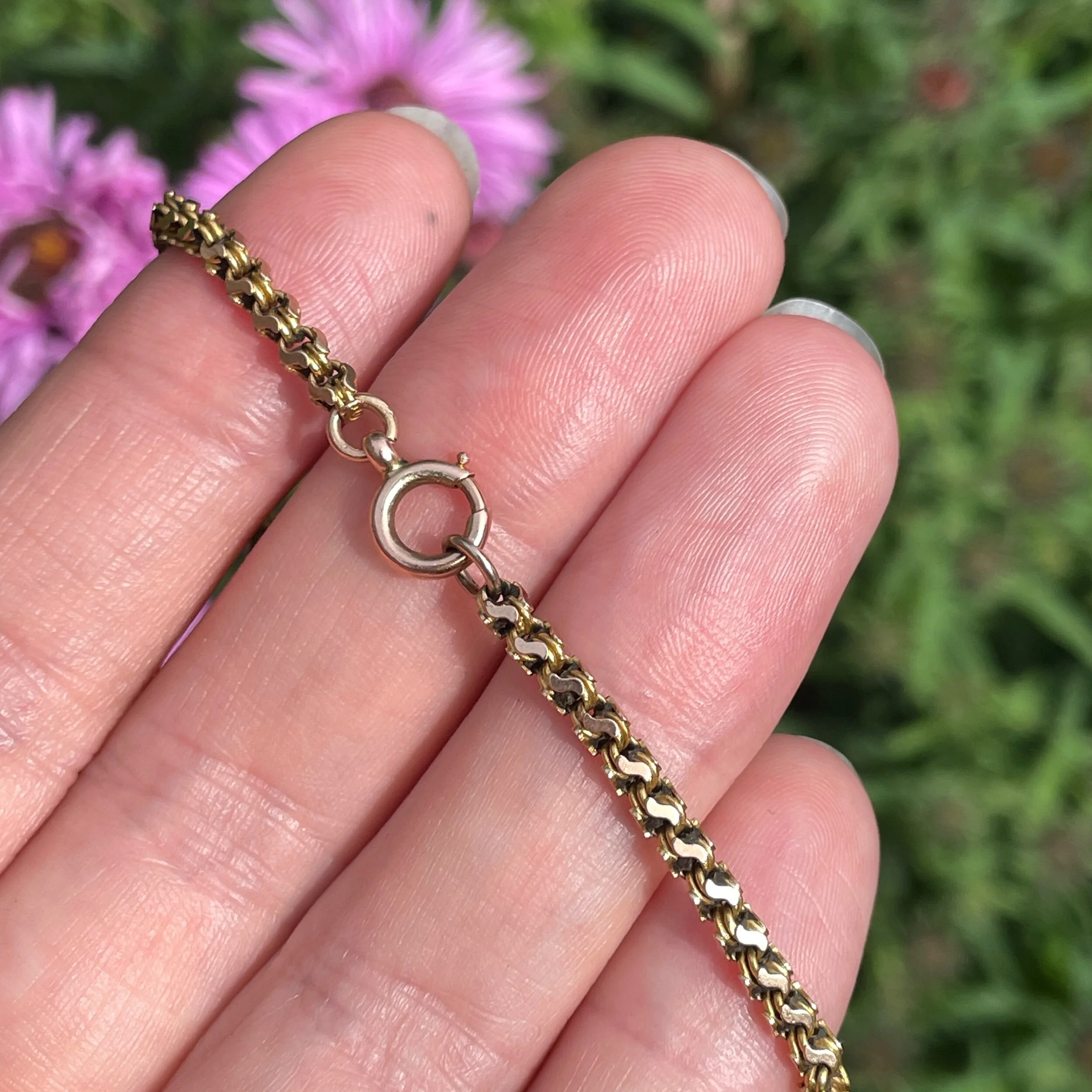 This antique book chain necklace is made from 10ct gold and it dates from the late Victorian/early Edwardian era. It features a beautiful fancy link chain which fastens with a bolt ring closure, and there’s another larger bolt ring in the centre which was designed too hold a locket (though they look fantastic holding charms too!). There’s a tiny plaque denoting it being 10ct on the end of one of the chains.