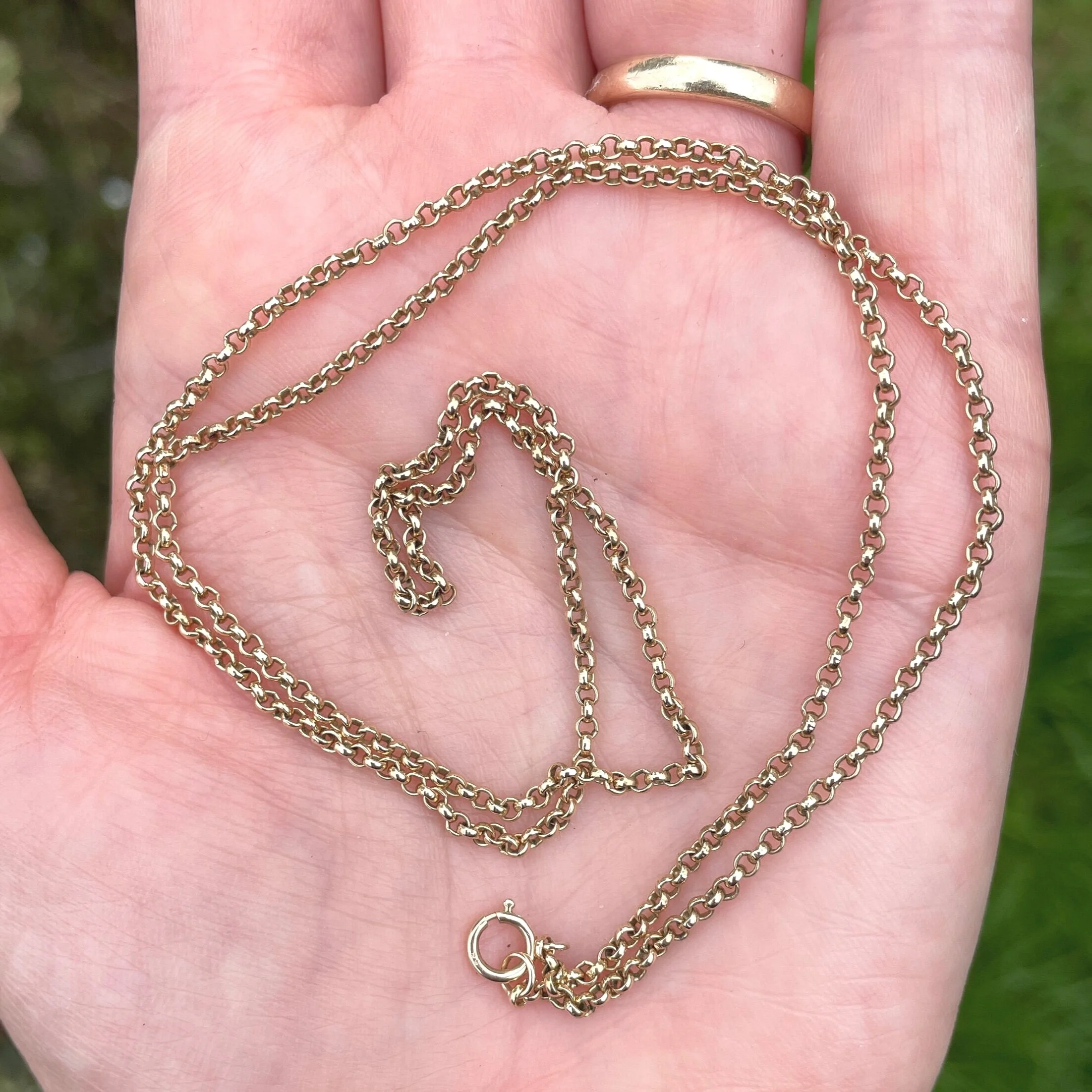 This vintage chain necklace is made from 9ct gold and it features a round belcher link chain which fastens with a bolt ring closure, which is stamped 9k.